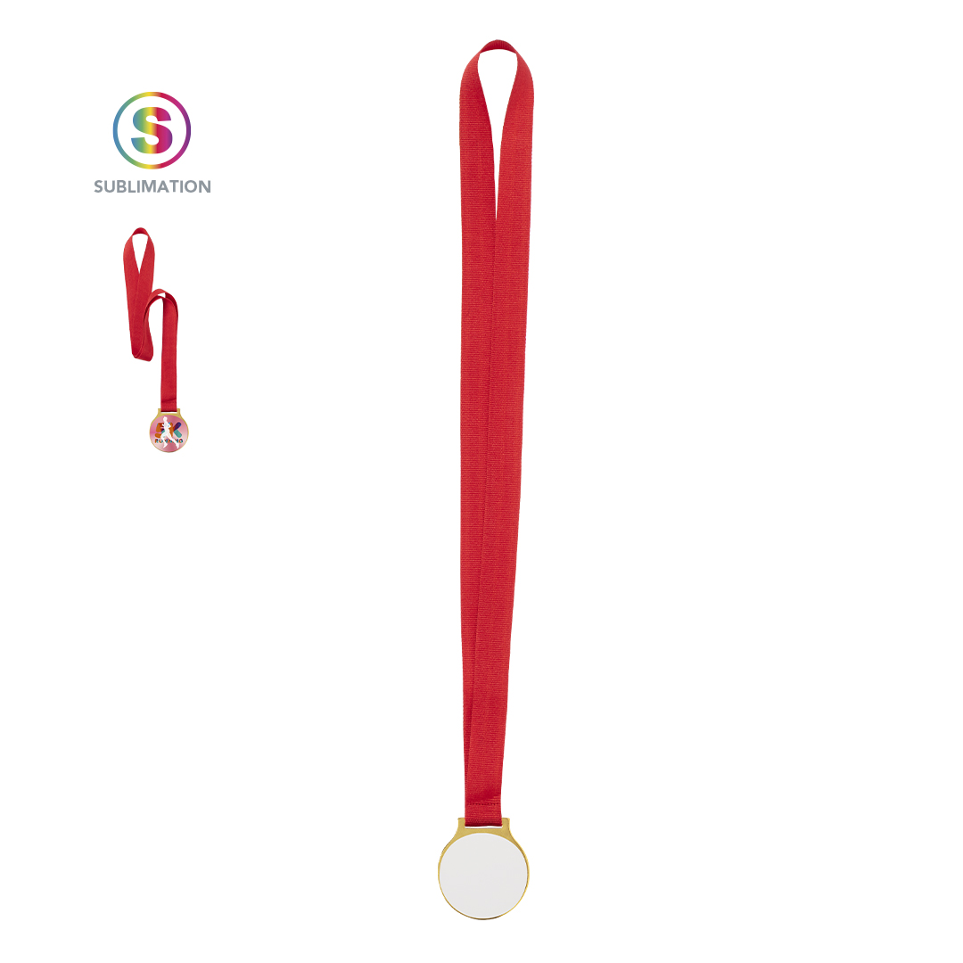 Metallmedaille mit glattem goldenen Finish, speziell für Sublimationsmarkierung entworfen (nicht im Produkt integriert, ideal zum Drucken und späteren Aufkleben). Rotes Polyesterband enthalten.