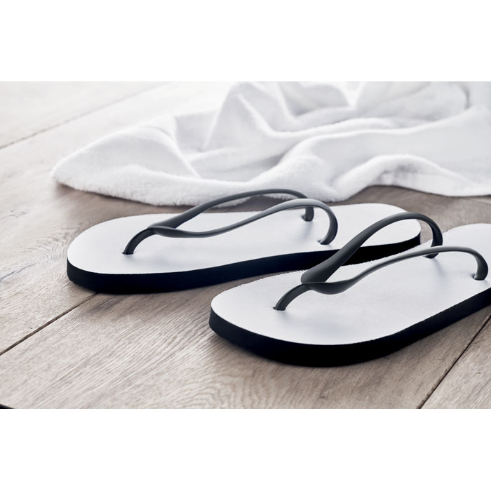 Sublimations-Zehensandalen mit Riemchen aus PVC. Sohle aus Gummi mit Bezug aus Polyester. Größe 42-44. Der Artikel kommt unmontiert. Der Artikel kann nur bedruckt bestellt werden.