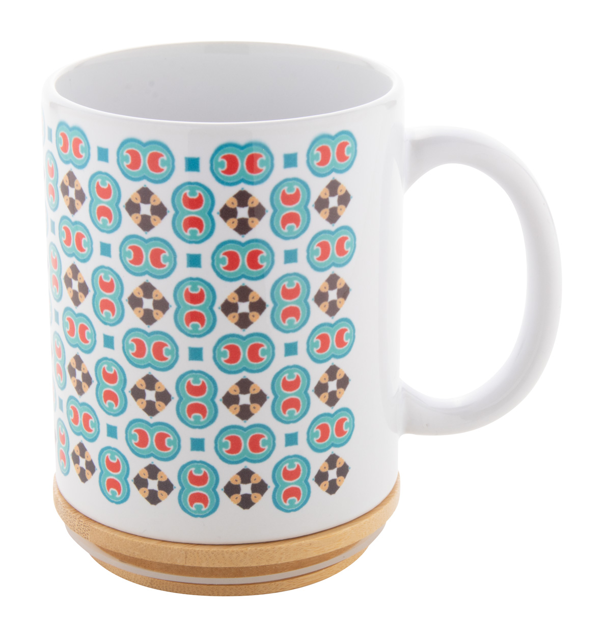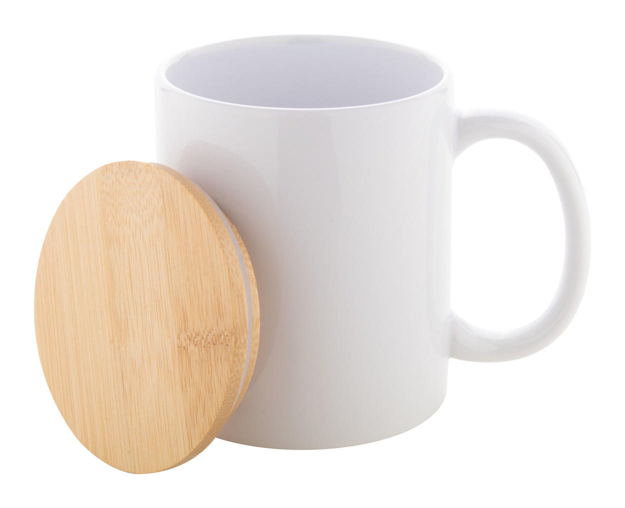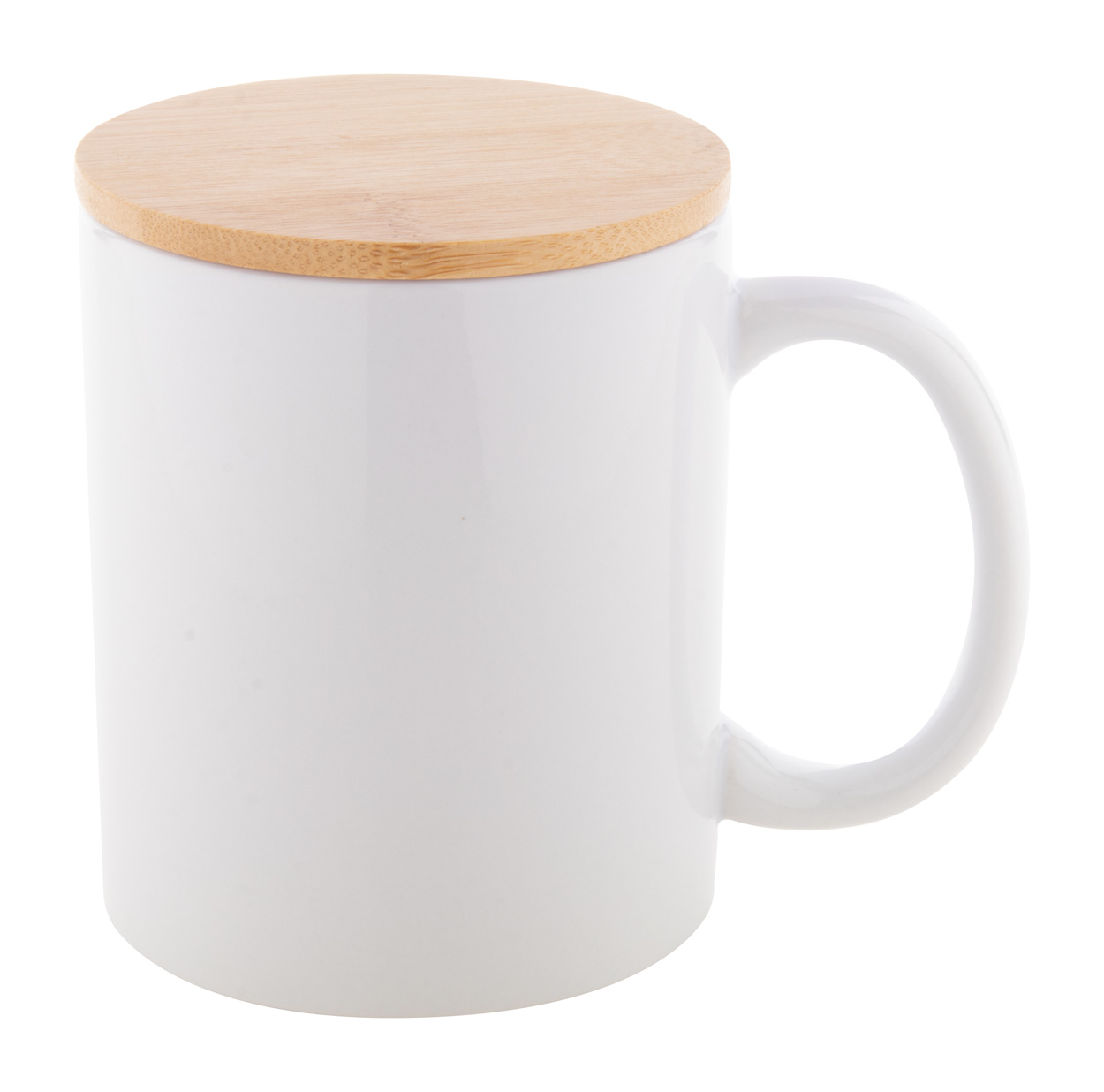 Weißer Keramikbecher mit Bambusdeckel, ideal für Sublimationsdruck, spülmaschinengeeignet. Füllmenge: 300 ml. In weißem Einzelkarton.