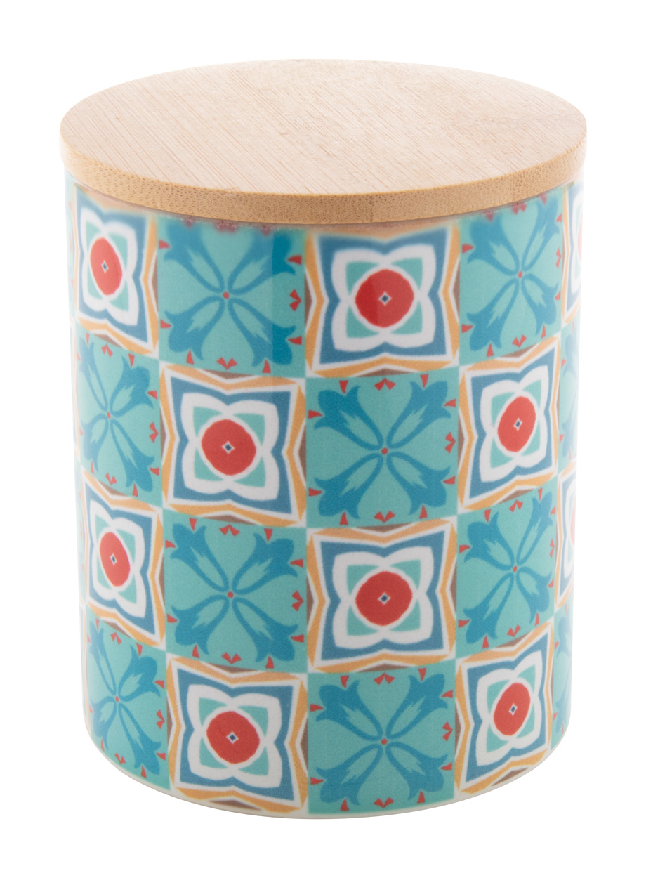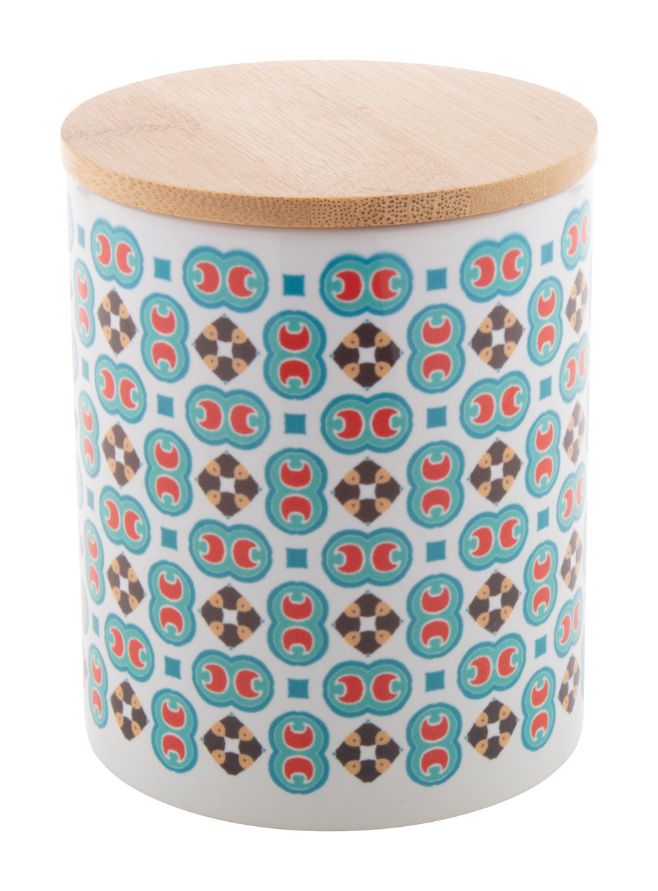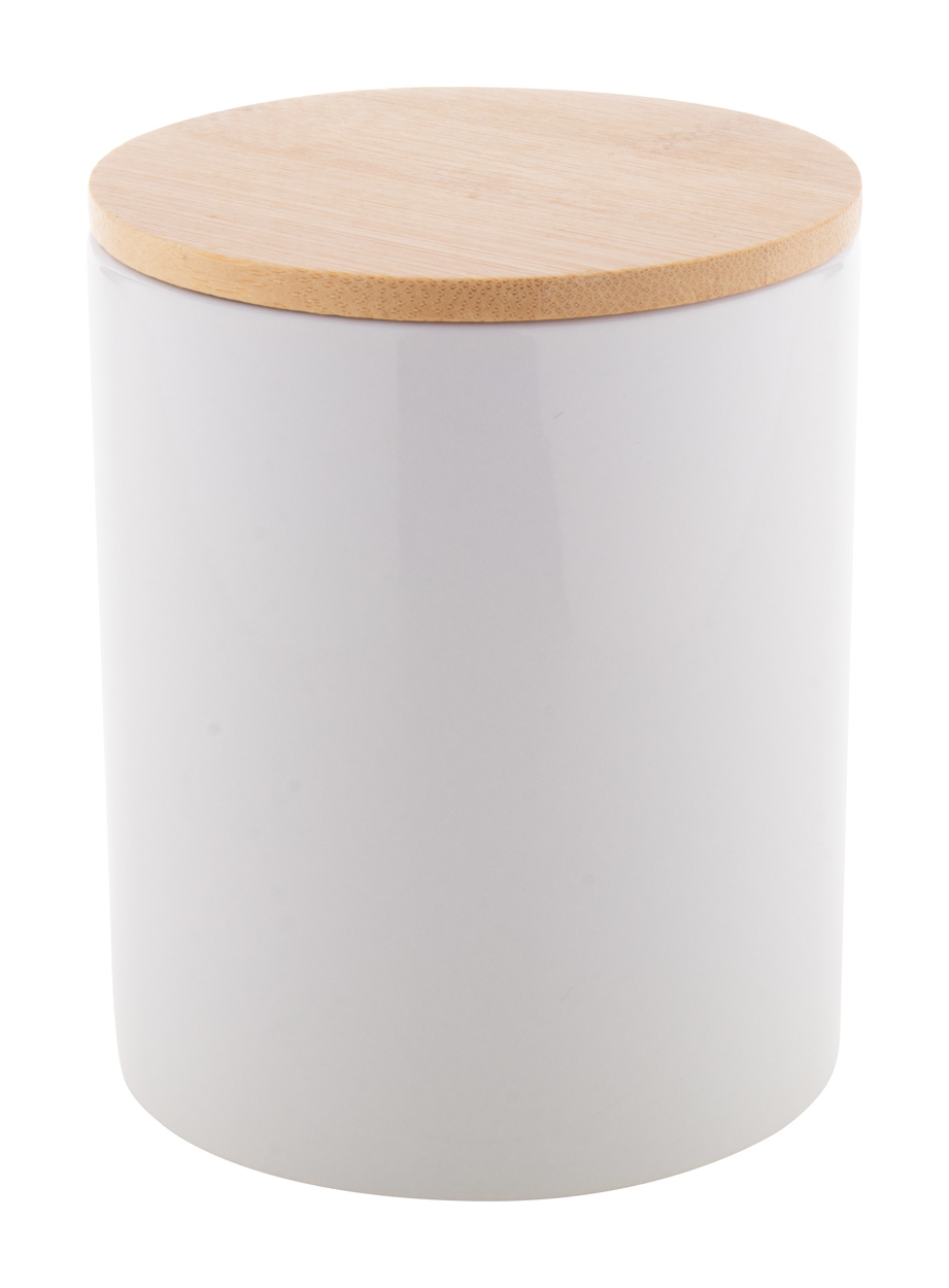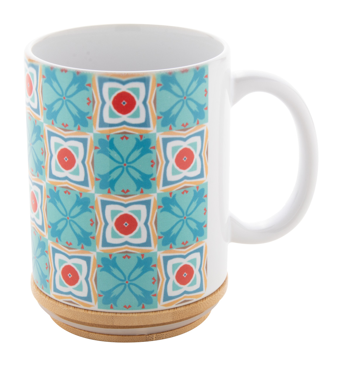 Weißer Keramikbecher mit Bambusdeckel, ideal für Sublimationsdruck, spülmaschinengeeignet. Füllmenge: 300 ml. In weißem Einzelkarton.