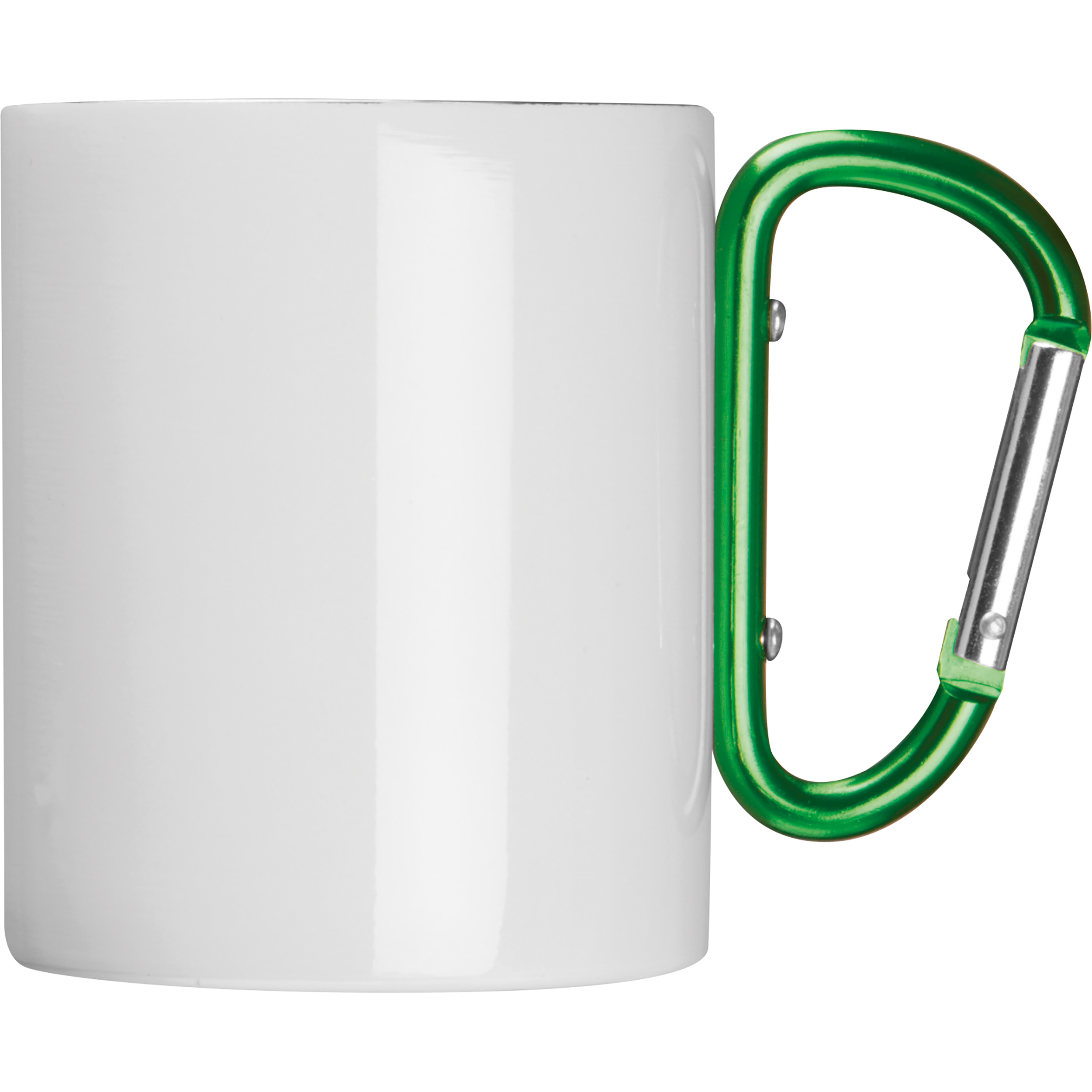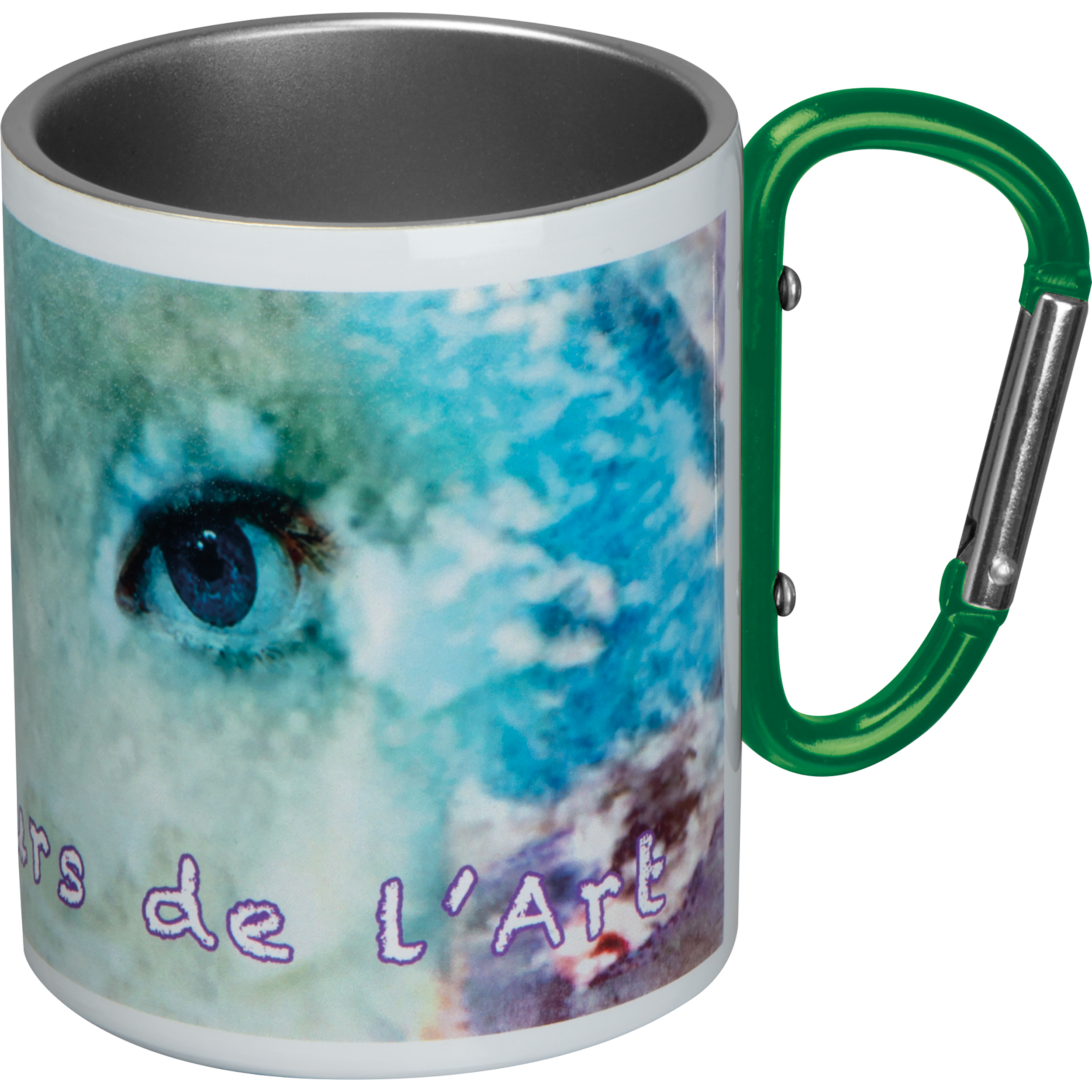 Doppelwandiger Trinkbecher aus Edelstahl mit farbigen Aluminium Karabinerhaken und einem Fassungsvermögen von 300ml. Ihre Werbung bringen wir mittels eines Sublimationsdrucks auf dem Becher an.