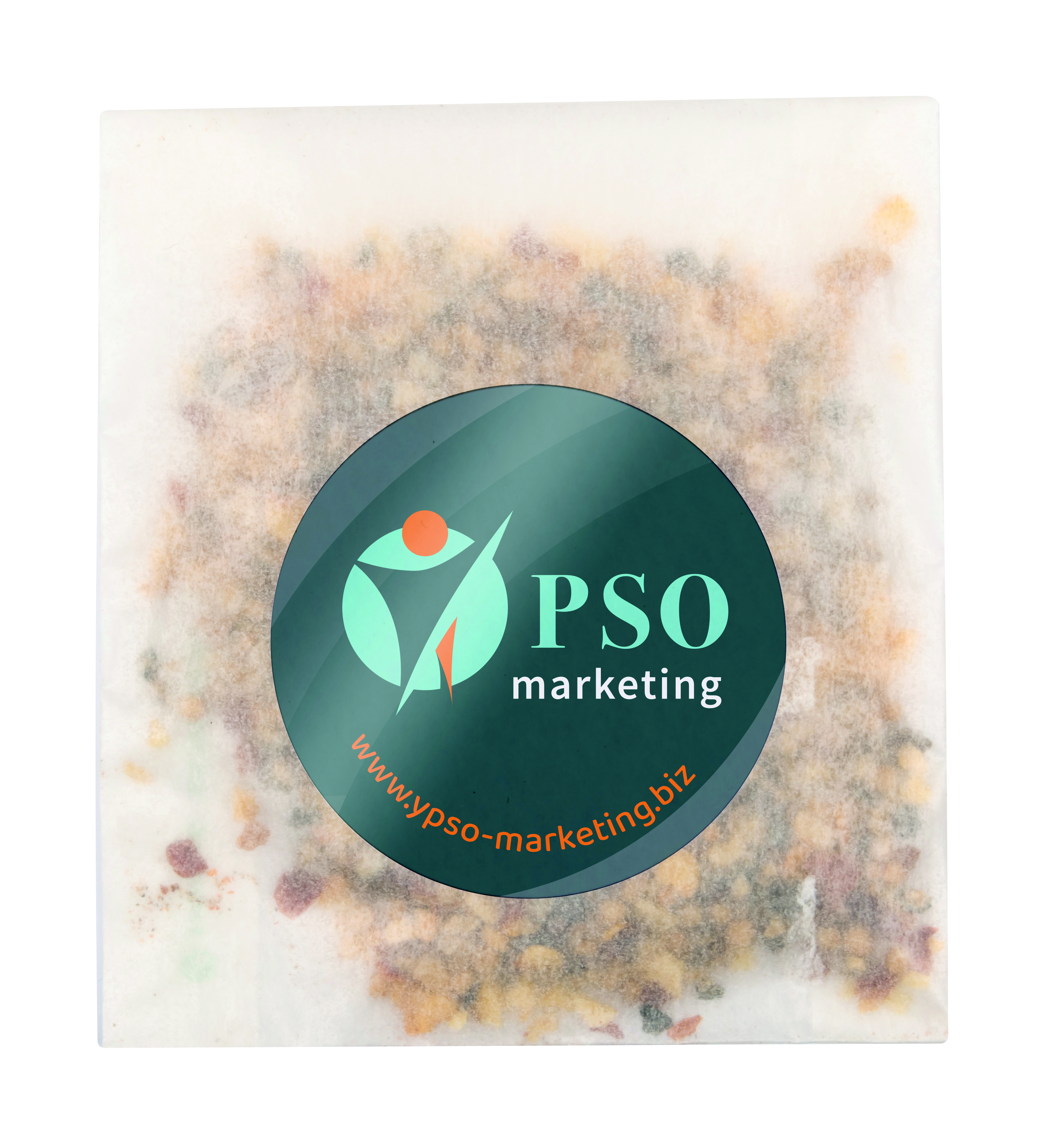 Pergamenttütchen mit unserem neuen süßem Topping "Schoko-Verführung" mit Cocoa-Nibs und braunem Kandis, inkl. 4c-Digitaletikett. Inhalt ca. 3 g (je nach Füllsorte). Druckvorkosten bereits inklusive.