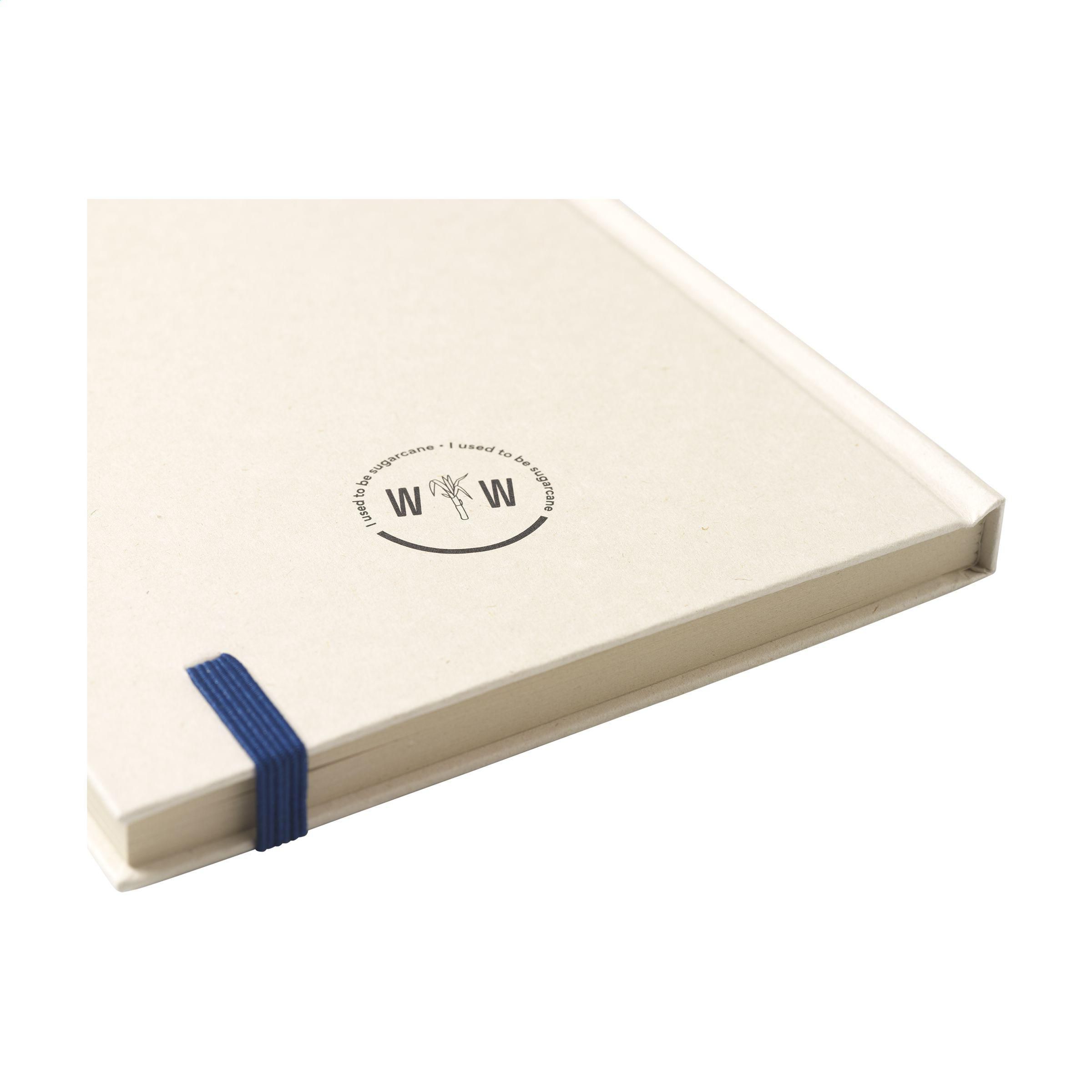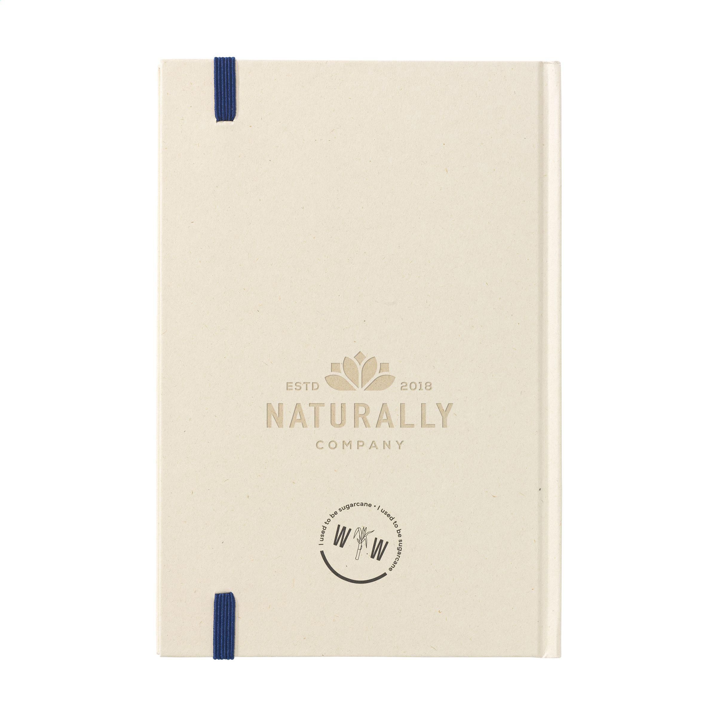 Exklusives Notizbuch im A5-Format, hergestellt aus recycelten Abfällen der Zuckerrohrpflanze. Mit Hardcover, 80 Blatt/160 Seiten liniertem Papier (100 g/m²) und Verschlussgummi. Der Einband und das Papier sind FSC®-zertifiziert. Das Papier, in dem kleine Fasern sichtbar sind, hat eine schöne hellbraune Farbe. Dabei wird Wert auf die Verwendung natürlicher Materialien gelegt. Nach der Ernte verbleiben die Wurzeln der Pflanze im Boden und die Stängel und Blätter werden zu einem Reststoff verarbeitet, der zur Herstellung von Bio-Kunststoff verwendet wird. Eine Zuckerrohrpflanze entzieht der Luft während ihres Wachstums CO2 und kann bis zu 10 Jahre alt werden.