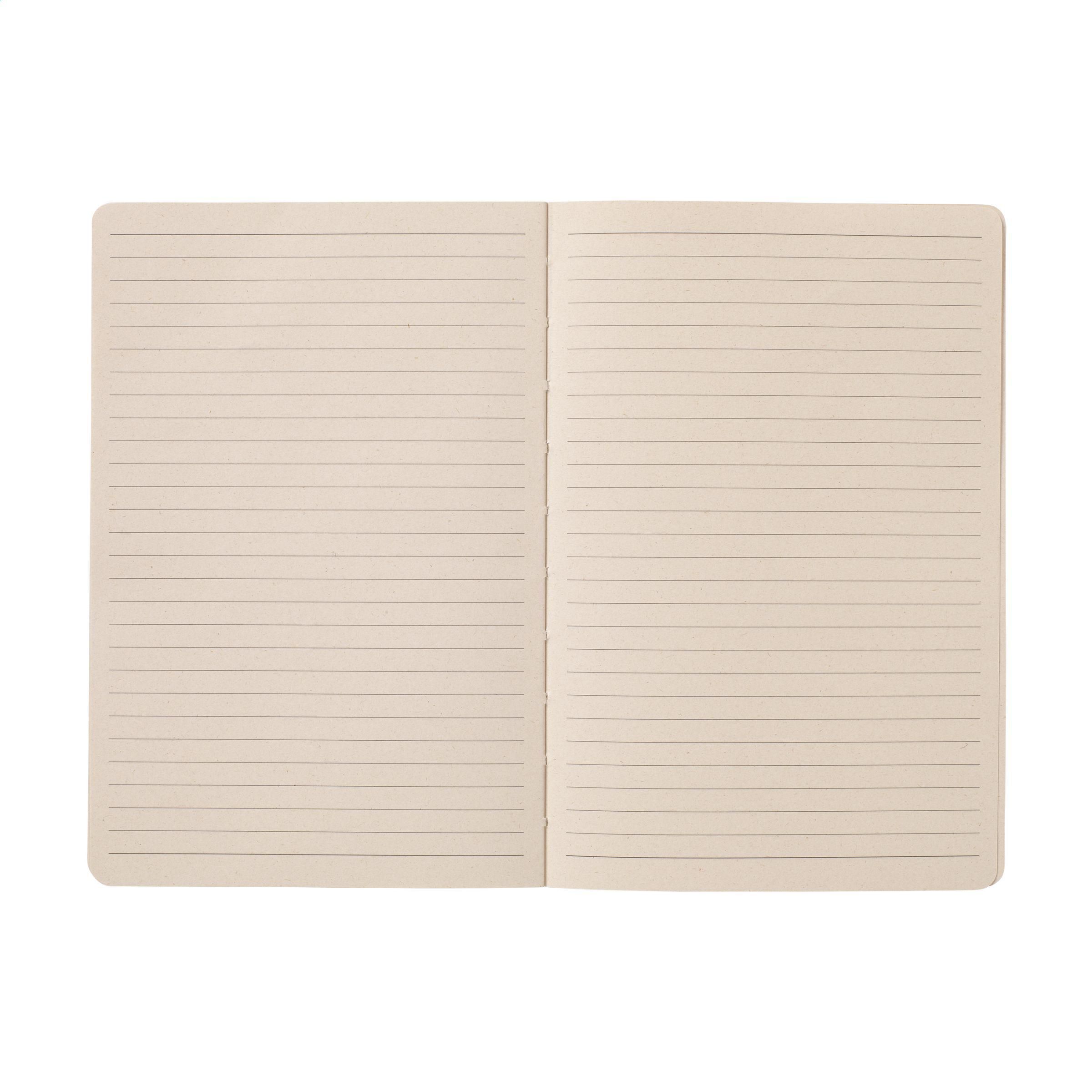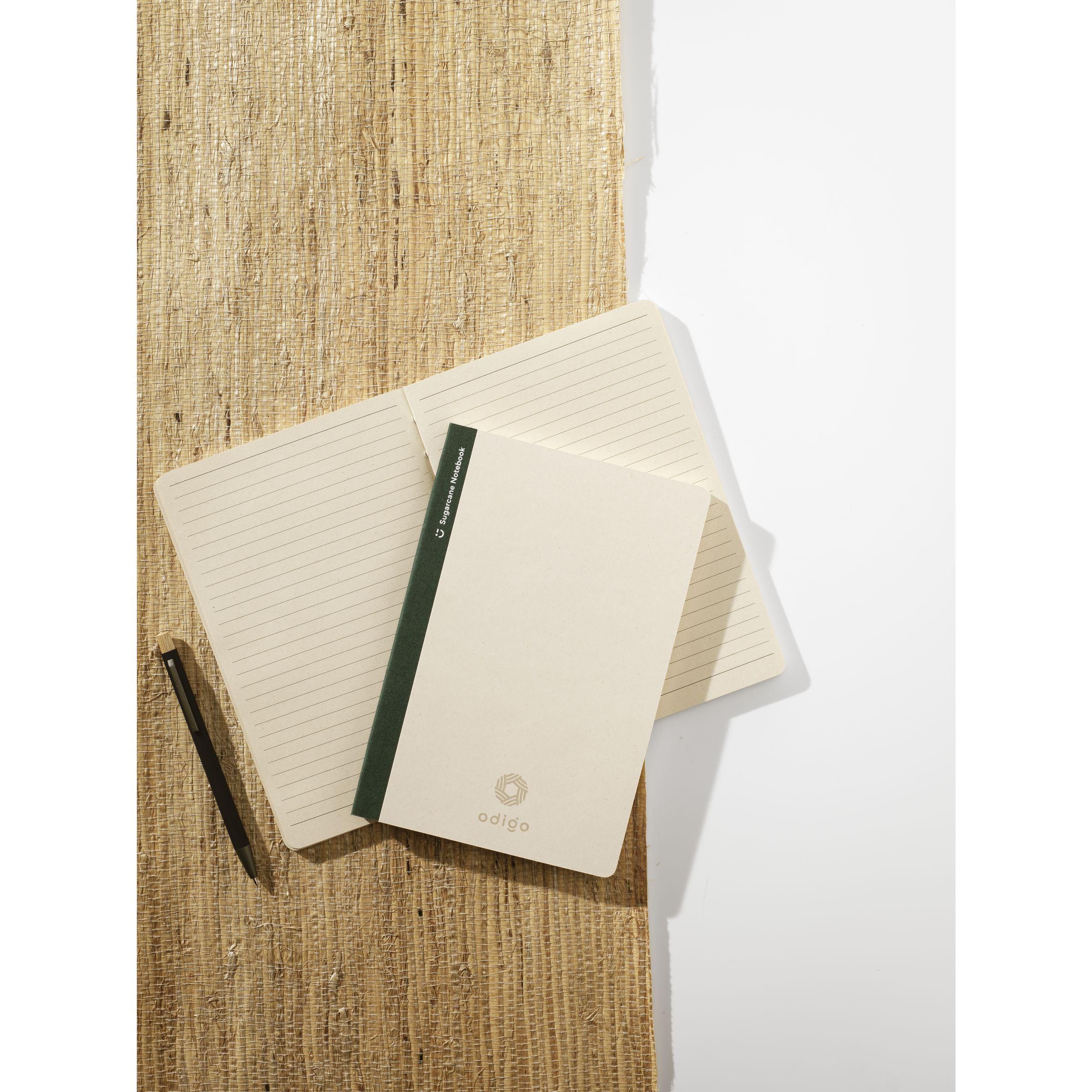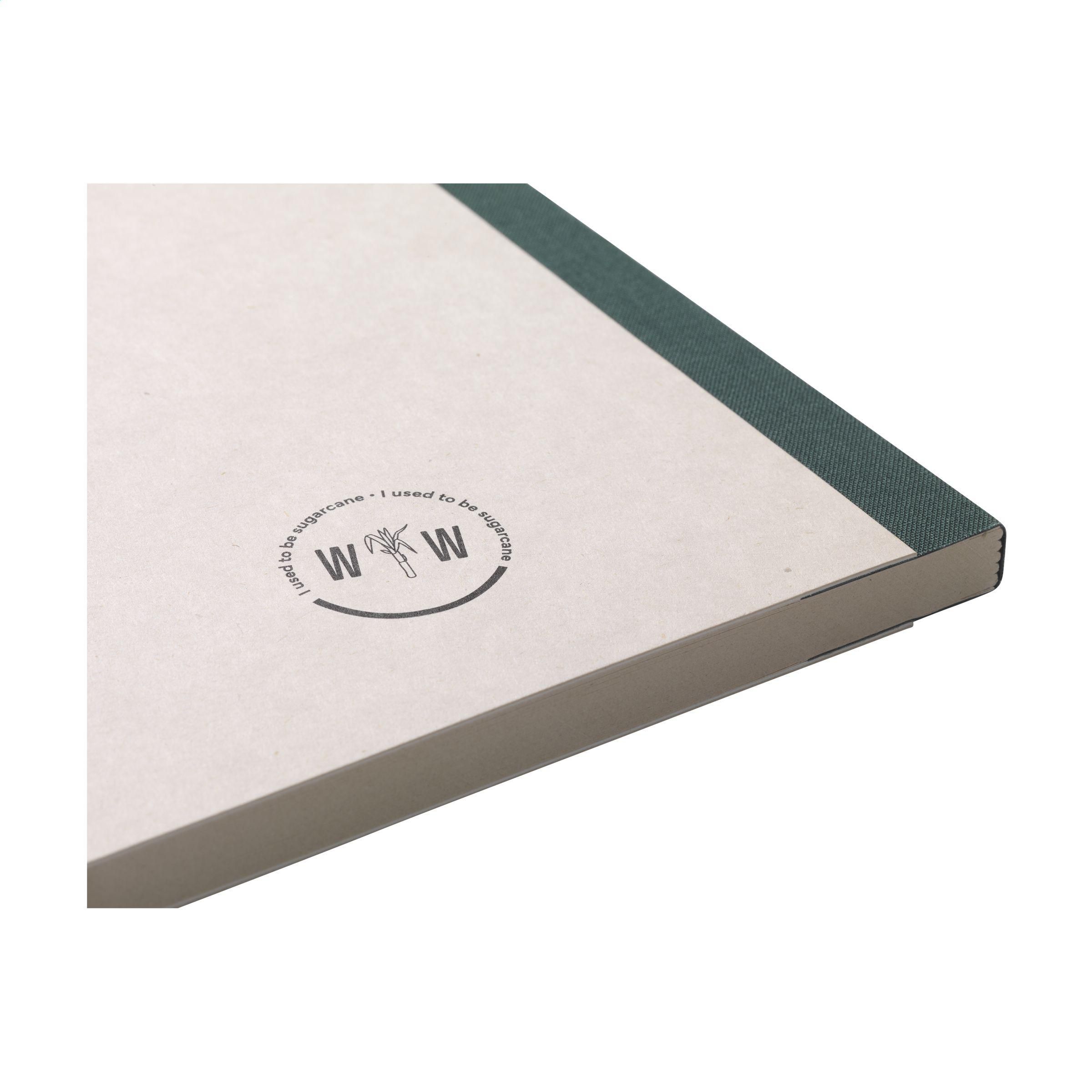 Exklusives Notizbuch im A5-Format, hergestellt aus recycelten Abfällen der Zuckerrohrpflanze. Mit Hardcover und 80 Blatt/160 Seiten liniertem Papier (100 g/m²). Der Einband und das Papier sind FSC Mix zertifiziert. Das Papier, in dem kleine Fasern sichtbar sind, hat eine schöne hellbraune Farbe. Dabei wird Wert auf die Verwendung natürlicher Materialien gelegt. Nach der Ernte verbleiben die Wurzeln der Pflanze im Boden und die Stängel und Blätter werden zu einem Reststoff verarbeitet, der zur Herstellung von Bio-Kunststoff verwendet wird. Eine Zuckerrohrpflanze entzieht der Luft während ihres Wachstums CO2 und kann bis zu 10 Jahre alt werden.