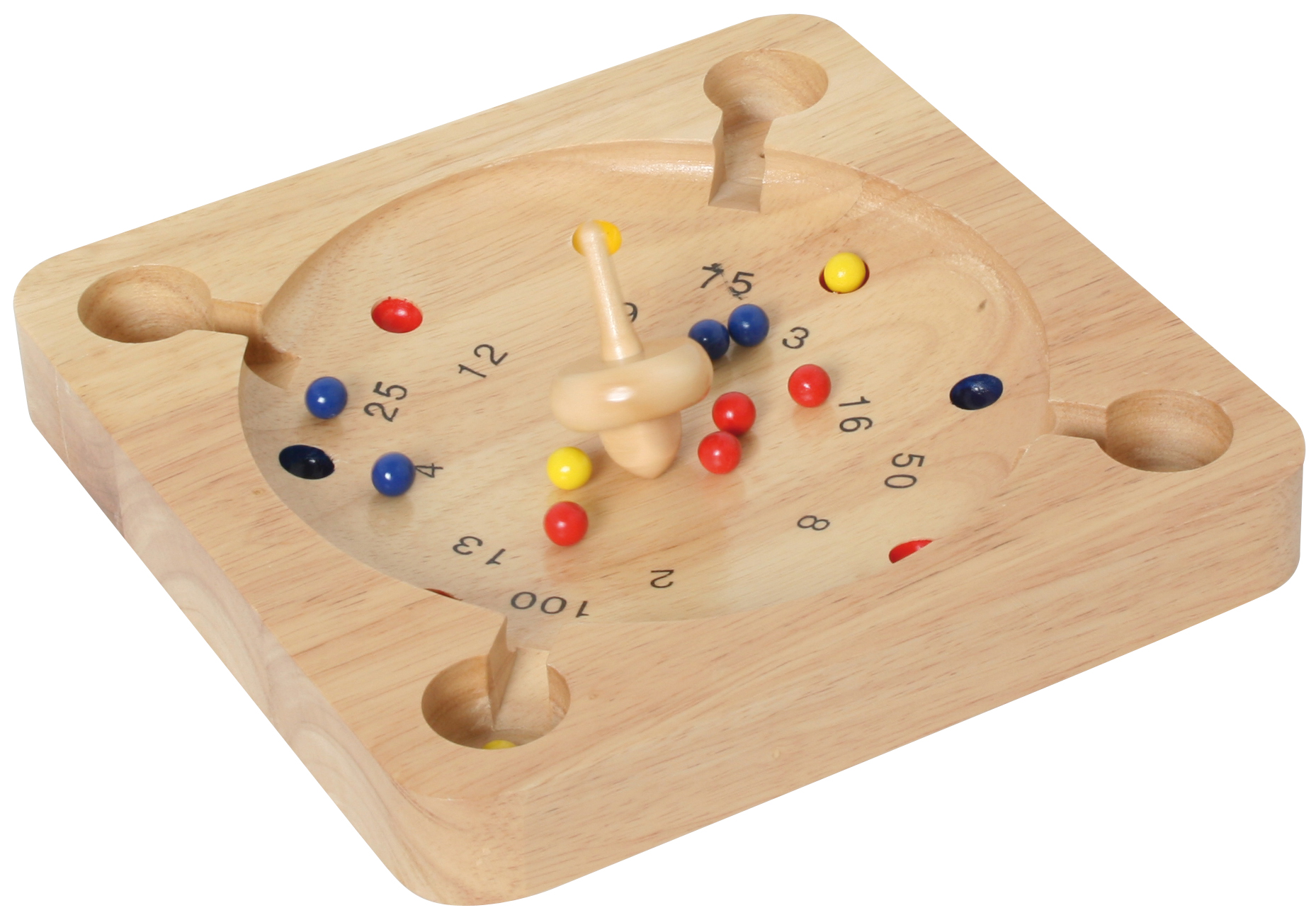 Exklusives Gesellschaftsspiel aus Holz. Mit zwölf Kugeln und einem Kreisel. Wer die meisten Punkte erzielt, gewinnt.