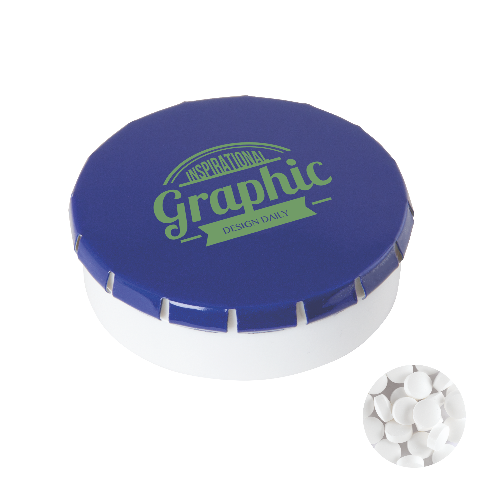 Super runde Click-Plastikdose Ø 45 mm x 15 mm mit ca. 12 g Minties zuckerfrei, TAMPONDRUCK. Boden aus weißem Plastik, versiegelt, mit Deckel aus Metall, erhältlich in einer großen Farbenvielfalt.