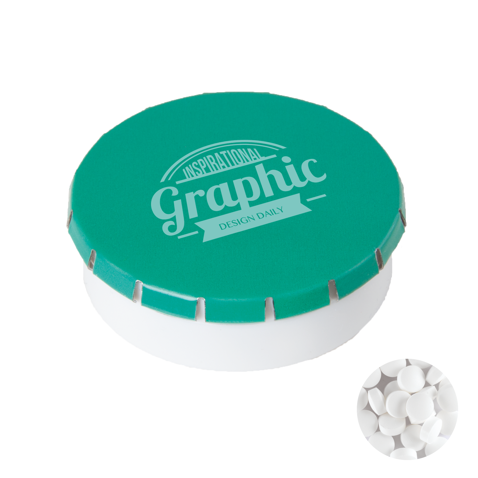 Super runde Click-Plastikdose Ø 45 mm x 15 mm mit ca. 12 g Minties zuckerfrei, TAMPONDRUCK. Boden aus weißem Plastik, versiegelt, mit Deckel aus Metall, erhältlich in einer großen Farbenvielfalt.