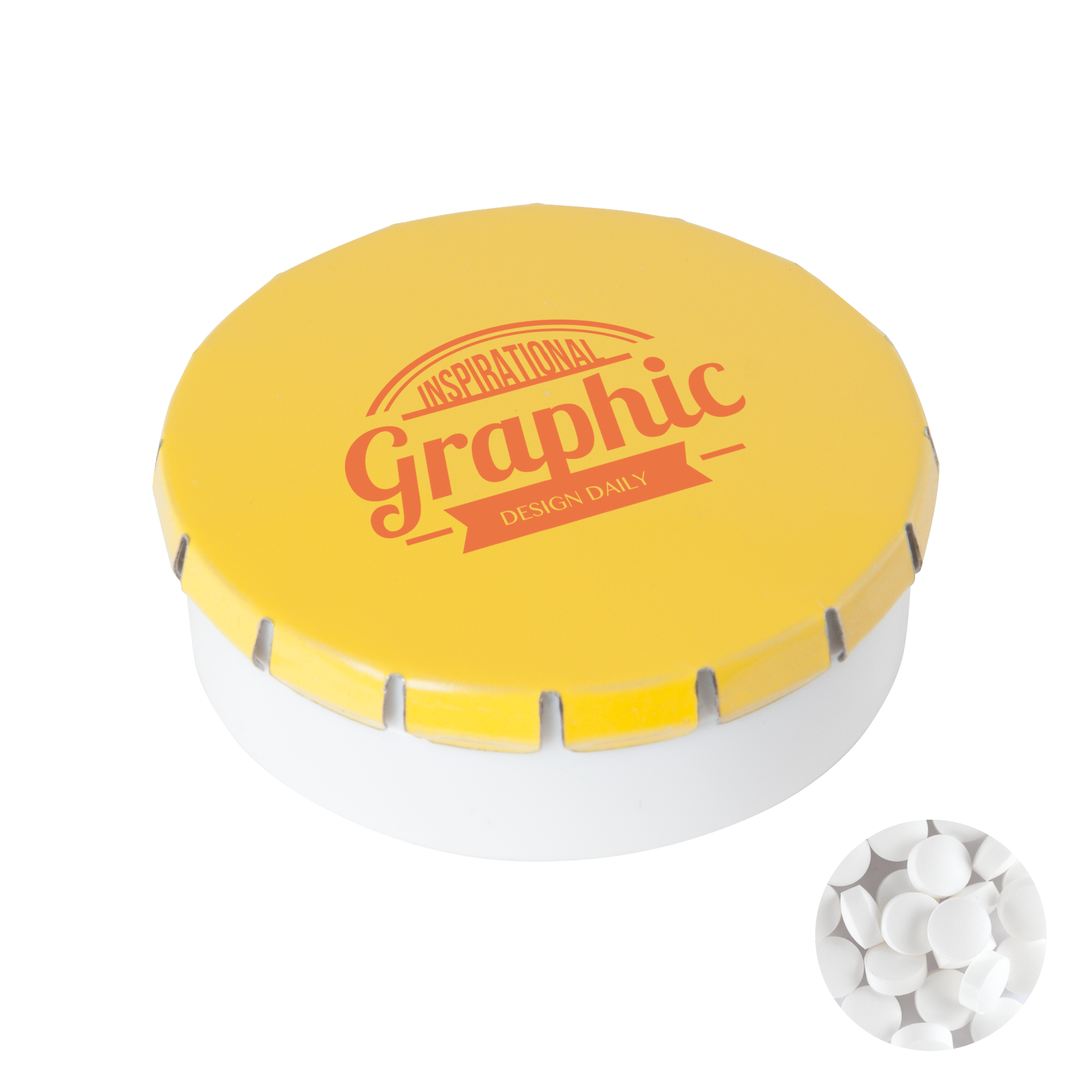 Super runde Click-Plastikdose Ø 45 mm x 15 mm mit ca. 12 g Minties zuckerfrei, TAMPONDRUCK. Boden aus weißem Plastik, versiegelt, mit Deckel aus Metall, erhältlich in einer großen Farbenvielfalt.
