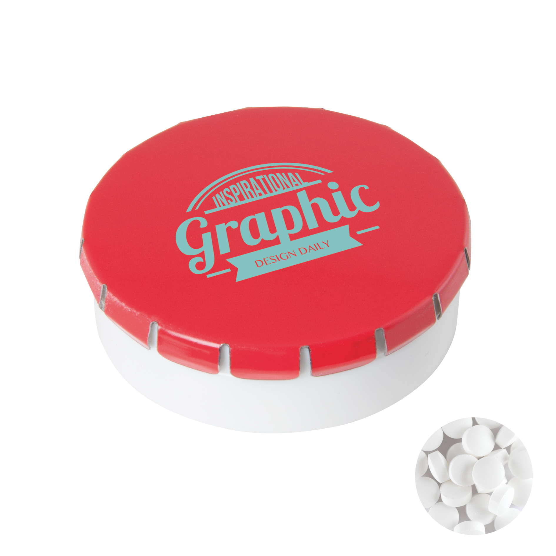 Super runde Click-Plastikdose Ø 45 mm x 15 mm mit ca. 12 g Minties zuckerfrei, TAMPONDRUCK. Boden aus weißem Plastik, versiegelt, mit Deckel aus Metall, erhältlich in einer großen Farbenvielfalt.
