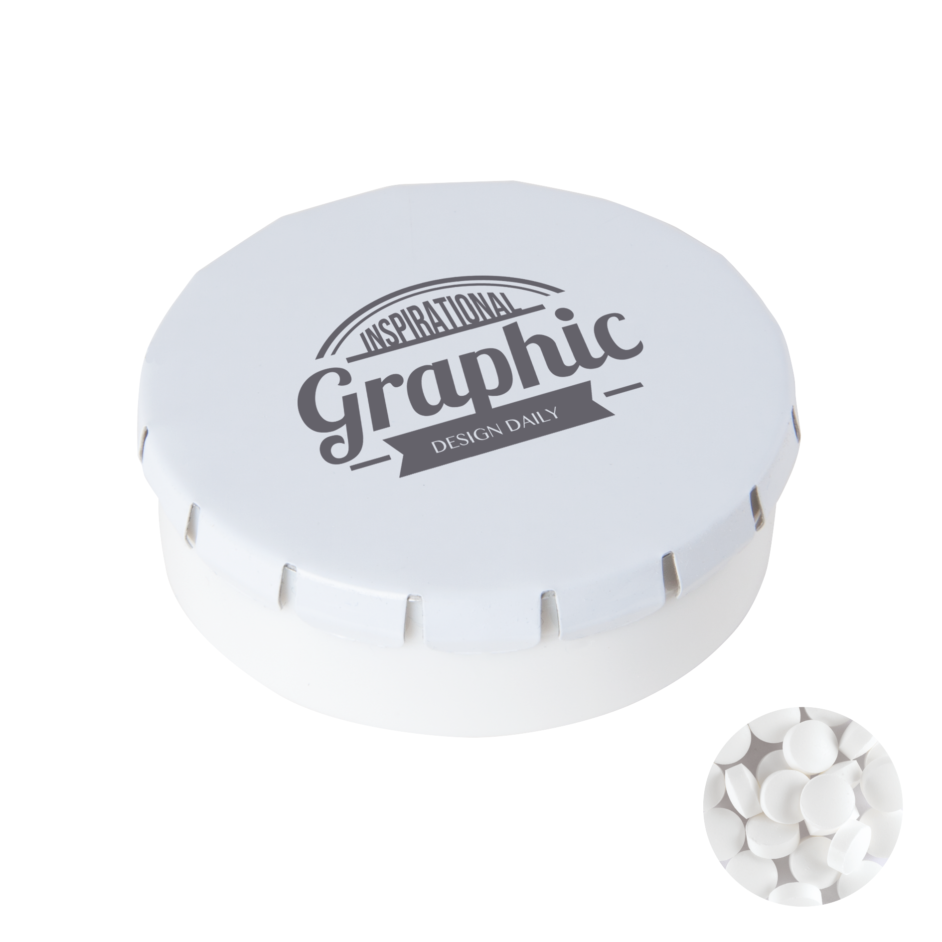 Super runde Click-Plastikdose Ø 45 mm x 15 mm mit ca. 12 g Minties zuckerfrei, TAMPONDRUCK. Boden aus weißem Plastik, versiegelt, mit Deckel aus Metall, erhältlich in einer großen Farbenvielfalt.