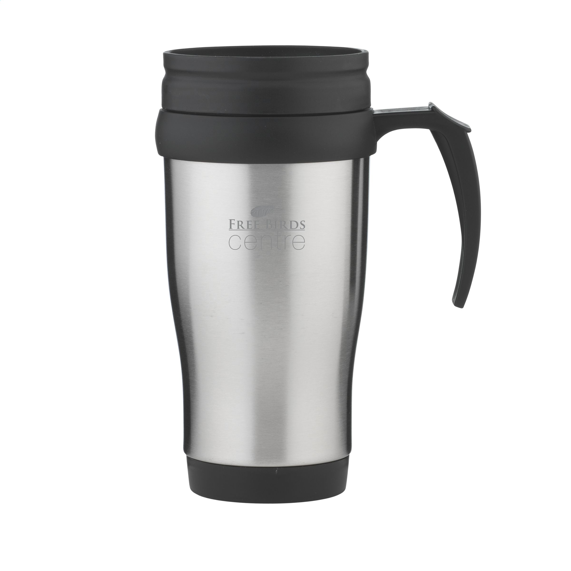 Doppelwandiger Edelstahl / Kunststoff-Thermobecher mit Schraubdeckel und Schiebe- / Klicköffnung. Nicht spülmaschinengeeignet. Fassungsvermögen 400 ml. Wird einzeln in einem Kraftkarton geliefert.