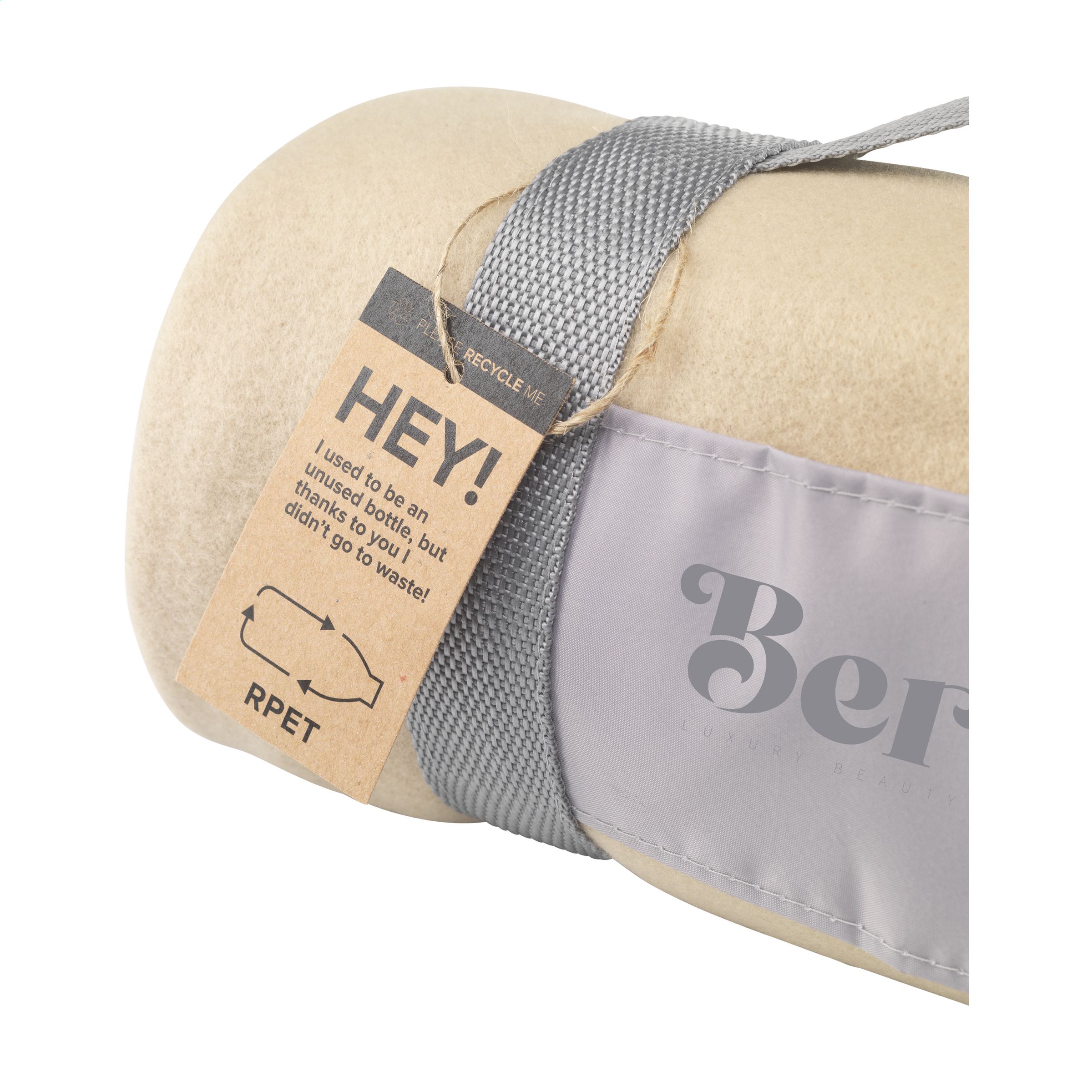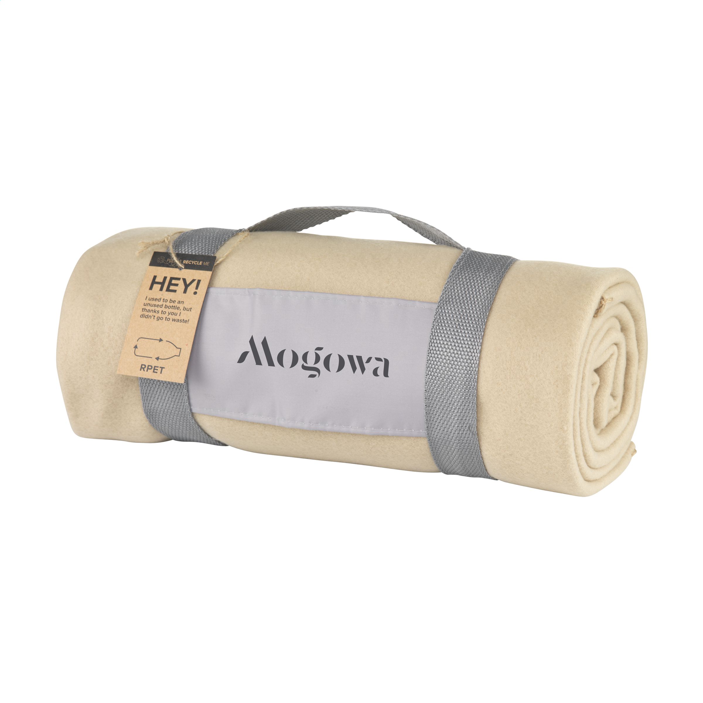 WoW! Fleecedecke aus 30% Polyester und 70% RPET-Polyester (180 g / m²). RPET-Polyester ist Material aus recycelten PET-Flaschen und recycelten Textilfasern. Mit praktischer Trageschlaufe. Maße aufgeklappt 150 x 120 cm.