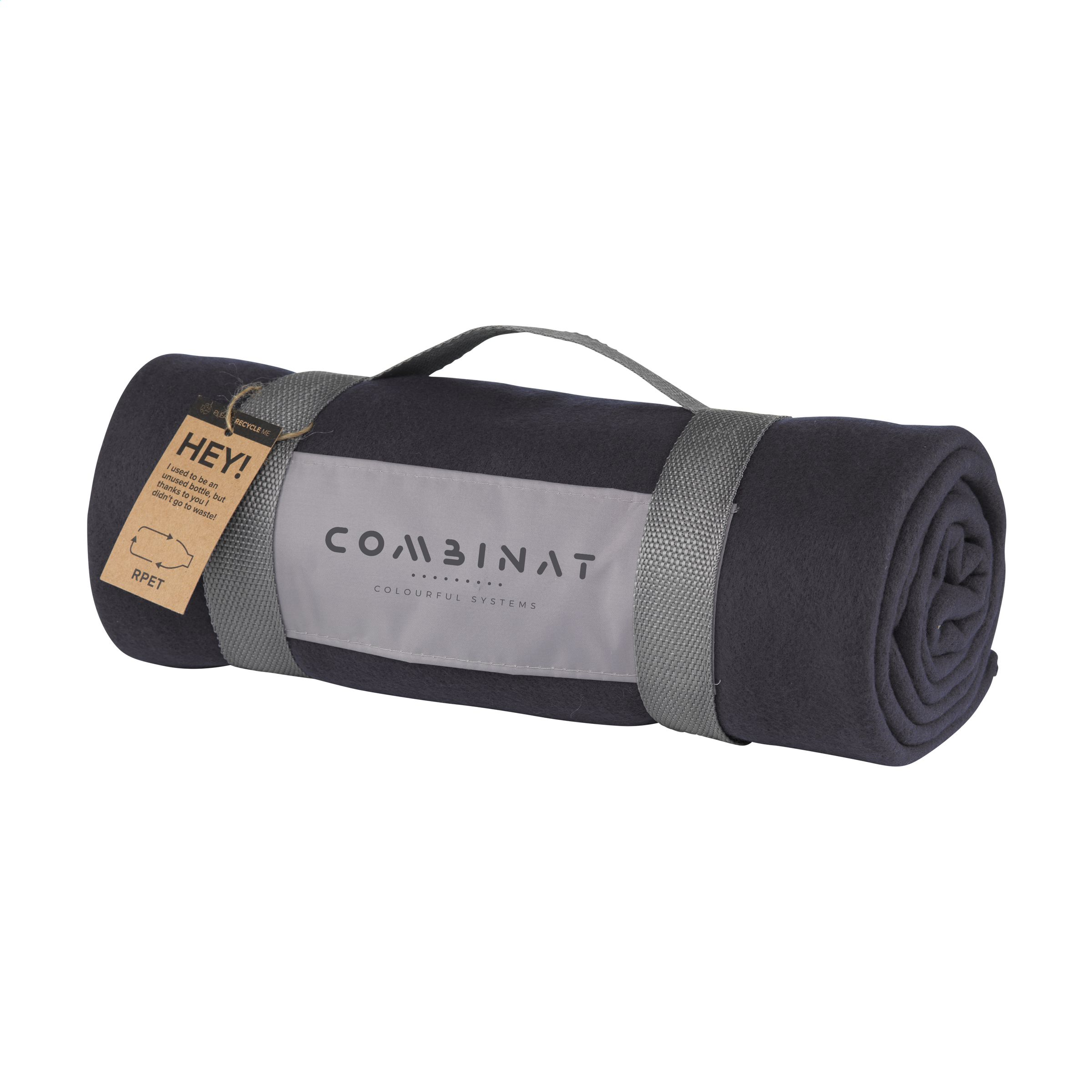 WoW! Fleecedecke aus 30% Polyester und 70% RPET-Polyester (180 g / m²). RPET-Polyester ist Material aus recycelten PET-Flaschen und recycelten Textilfasern. Mit praktischer Trageschlaufe. Maße aufgeklappt 150 x 120 cm.