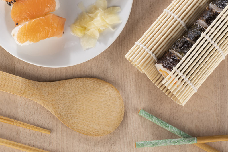 Das NIGIRI Sushi-Set wird jeden Amateur der eigenen Sushi-Zubereitung begeistern. Das Set enthält zwei Rollmatten, einen Bambuslöffel, ein Spreizmesser und vier Paar Essstäbchen mit dem Original BLUE COLLECTION-Aufdruck. Set: Matte: 240 x 230 x 4 mm; Messer: 30 x 180 x 9 mm; Löffel: 65 x 200 x 7 mm; Essstäbchen: ⌀ 7 x 227 mm.