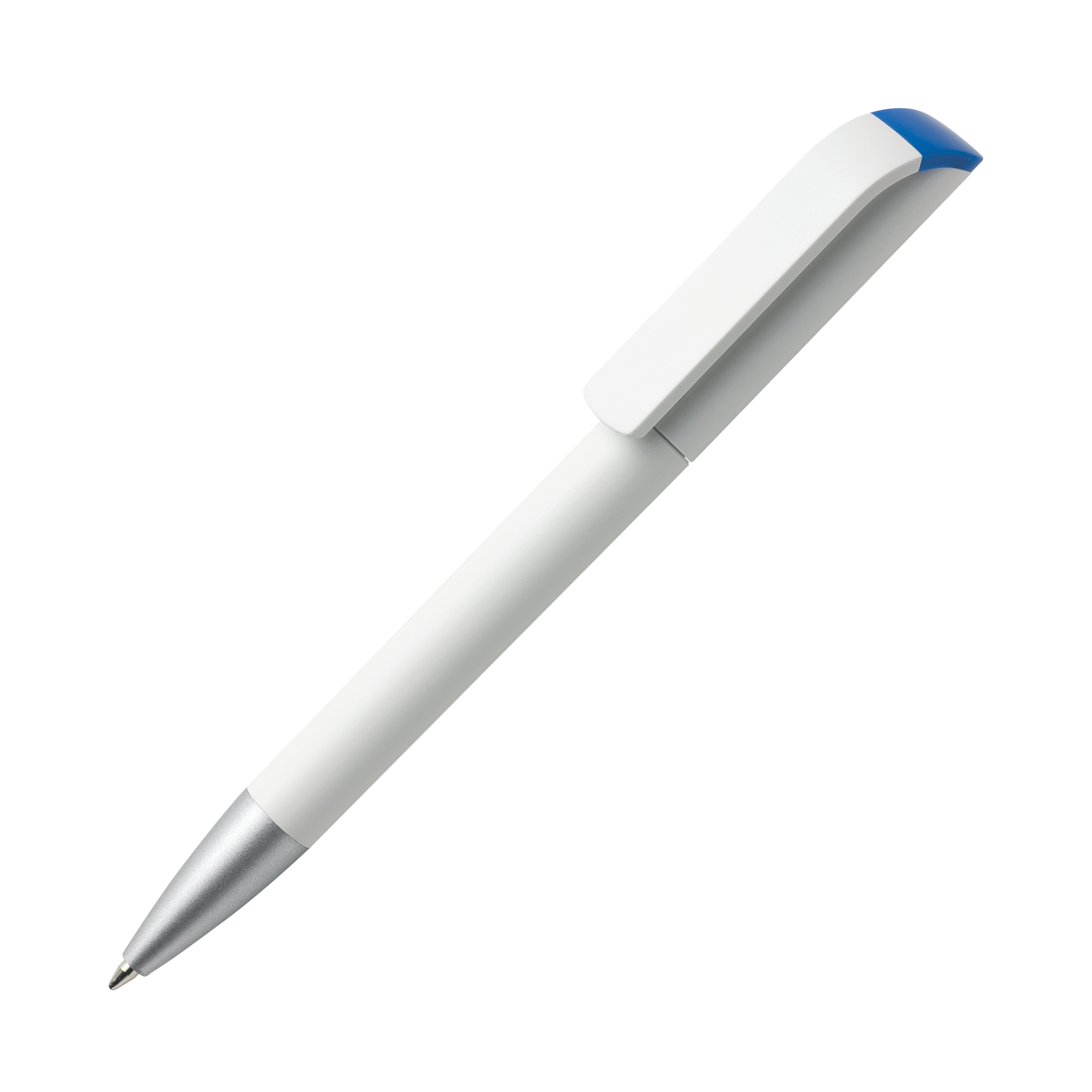 TAG TA1 MATT AL B Kugelschreiber Maxema, Design in Reinform - Im Kugelschreiber mit Drehmechanik TAG ist es Maxema gelungen, schlichte Eleganz und Funktion in Harmonie zu vereinen Die harmonische Linie des Gehäuses und der auffallend kräftig gebogene Clip sind aus hochwertigem ABS in einer weißen Mattversion gefertigt und werden ergänzt durch eine matte Metallspitze. Hervorsticht die glänzende Clip-Basis, die in 17 verschiedenen Farben lieferbar ist. Der Kugelschreiber ist ausgestattet mit einer blauschreibenden Großraummine.