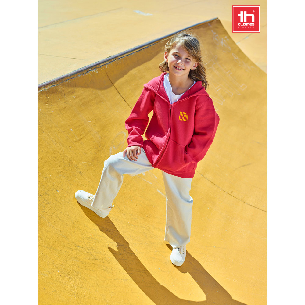 Enzym behandelte Kinderjacke aus amerikanischem Frottee (50% Baumwolle aus nachhaltigem Anbau) und 50% recyceltem Polyester (320 g / m²). Gefütterte Kapuze ohne Kordelzug mit Jersey in der gleichen Farbe wie die Jacke, entsprechend den Sicherheitsstandards der Europäischen Union. Mit 1 x 1-Rippbündchen an Ärmeln und Saum, 2 Seitentaschen, Reißverschluss mit Schieber, Puller und kardierter Innenseite. Größen: 4, 6, 8, 10, 12