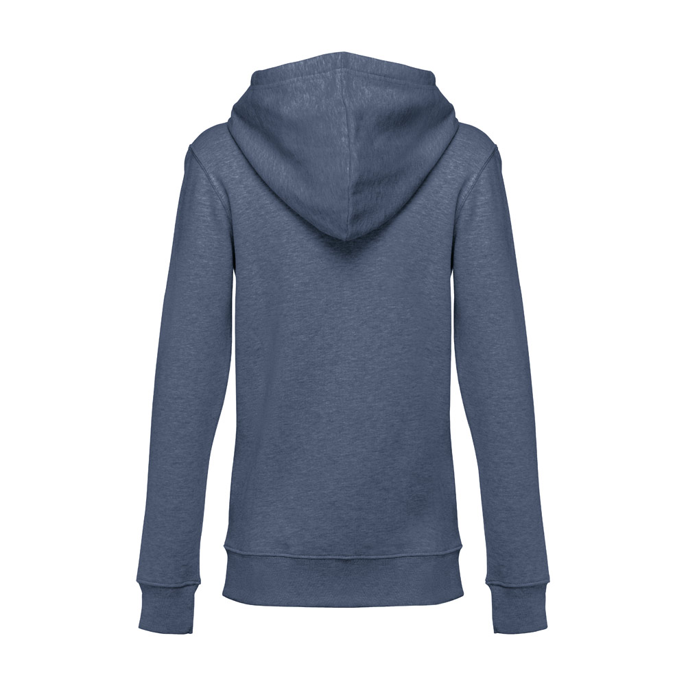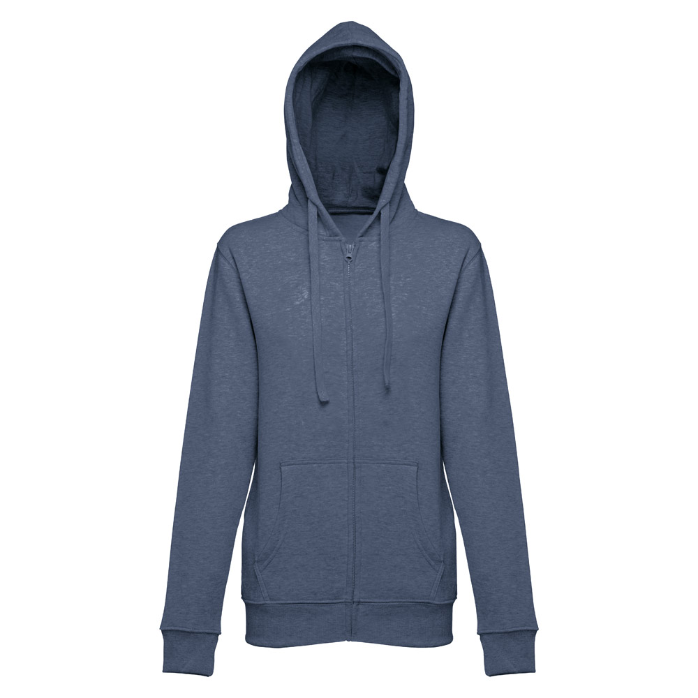 Damen Sweatjacke aus 50% Baumwolle und 50% Polyester (320g / m²) mit Reißverschluss und gefütterter Kapuze mit Kordelzug. Kardiert mit 2 Kängurutaschen, einem verdeckten Kunststoffreißverschluss und einem gerripten Bund. Größen: S, M, L, XL, XXL
