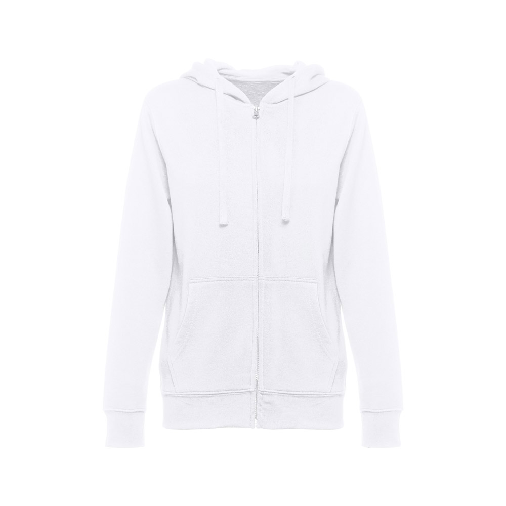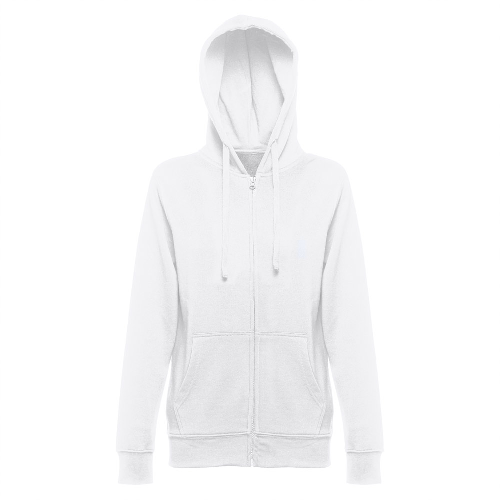 Damen Sweatshirt aus 50% Baumwolle und 50% Polyester (320 g / m²) mit kardierter Innenseite. Die Kapuze ist gefüttert und hat eine farblich abgestimmte Kordel. Auf der Vorderseite befinden sich 2 Beuteltaschen mit verdecktem Plastikreissverschluss. Ripp an Bund und Ärmeln. Größen: S, M, L, XL, XXL