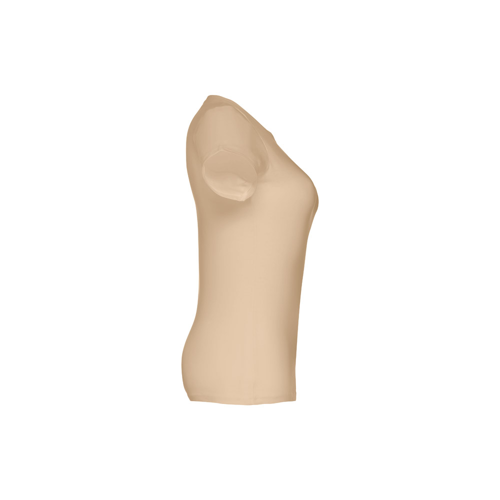 Damen T-shirt aus 100% Strickjersey und Baumwolle (190g / m²) mit kardiertem Baumwollfaden, tailliert. Diese hat einen dünnen Jersey-Kragen mit Satin-Verstärkungsband und Doppelnaht an Ärmeln und Saum. Bei der Farbe 183 bestehend aus 90% Baumwolle und 10% Viskose. Größen: S, M, L, XL, XXL