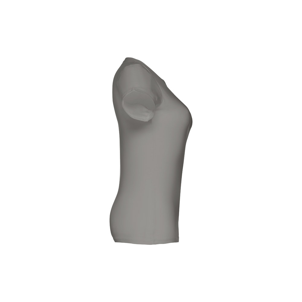 Damen T-shirt aus 100% Strickjersey und Baumwolle (190g / m²) mit kardiertem Baumwollfaden, tailliert. Diese hat einen dünnen Jersey-Kragen mit Satin-Verstärkungsband und Doppelnaht an Ärmeln und Saum. Bei der Farbe 183 bestehend aus 90% Baumwolle und 10% Viskose. Größen: S, M, L, XL, XXL