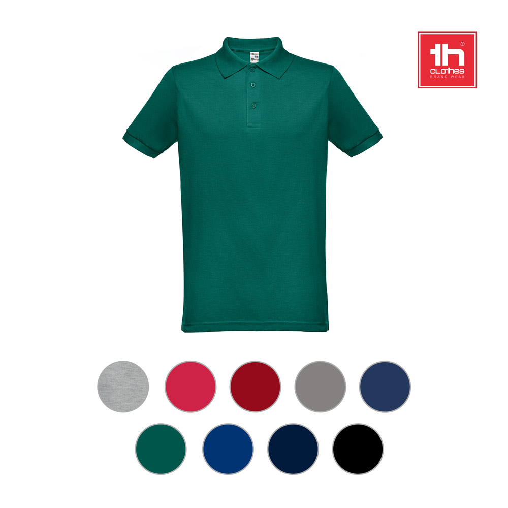 Herren Poloshirt aus Piqué Stoff 65% Polyester und 35% kardierter Baumwolle (200g / m²) mit geripptem Kragen und Ärmeln, Verstärkungsband am Kragen, verstärkte Knopfleiste mit 3 farblich abgestimmten Knöpfen und einem Ersatzknopf an der Innennaht. Bei der Farbe 183 bestehend aus 85% Baumwolle und 15% Viskose. Größen: XS, S, M, L, XL, XXL