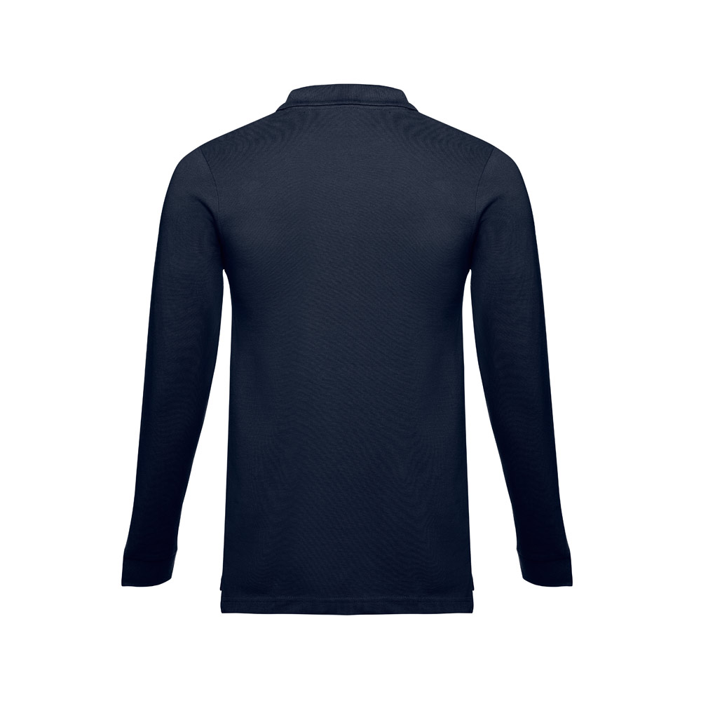Herren langarm Poloshirt aus Piqué Stoff 100% kardierter Baumwolle (210g / m²) mit geripptem Kragen und Ärmelbund, einem Verstärkungsband am Kragen, einer verstärkten Knopfleiste mit 3 farblich abgestimmten Knöpfen und einem Ersatzknopf an der Innennaht. Unten mit seitlichen Öffnungen. Bei der Farbe 183 bestehend aus 85% Baumwolle und 15% Viskose. Etikett ist abreissbar. Größen: S, M, L, XL, XXL
