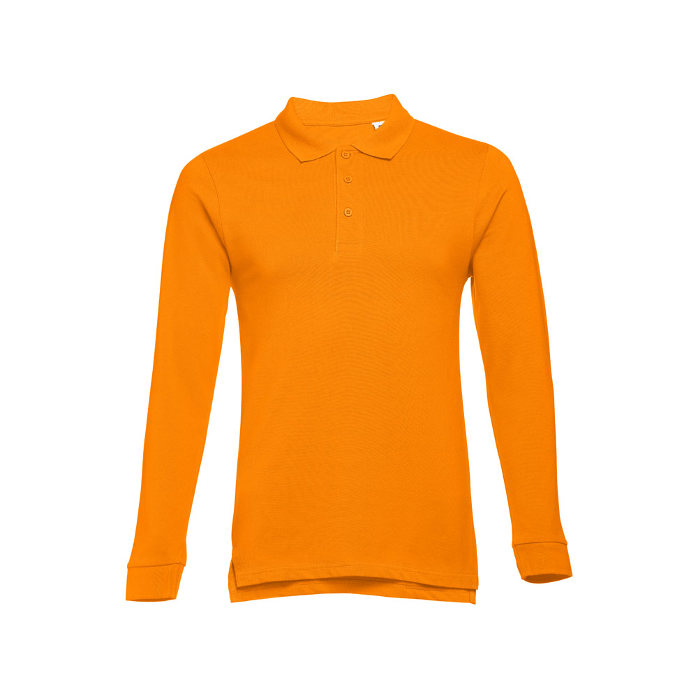 Herren langarm Poloshirt aus Piqué Stoff 100% kardierter Baumwolle (210g / m²) mit geripptem Kragen und Ärmelbund, einem Verstärkungsband am Kragen, einer verstärkten Knopfleiste mit 3 farblich abgestimmten Knöpfen und einem Ersatzknopf an der Innennaht. Unten mit seitlichen Öffnungen. Bei der Farbe 183 bestehend aus 85% Baumwolle und 15% Viskose. Etikett ist abreissbar. Größen: S, M, L, XL, XXL