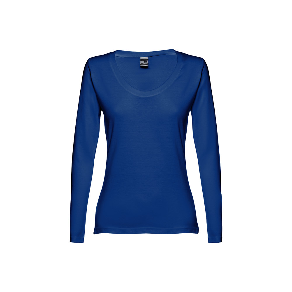 Damen Langarmshirt aus 100% Strickjersey und Baumwolle (150g / m²), tailliert mit kardiertem Baumwollfaden. Bei den Farben 194, 195 bestehend aus 60% Baumwolle und 40% Polyester und Farbe 183 bestehend aus 90% Baumwolle und 10% Viskose, mit Jersey-Kragen, Doppelnaht an Ärmeln und Saum. Größen: S, M, L, XL, XXL