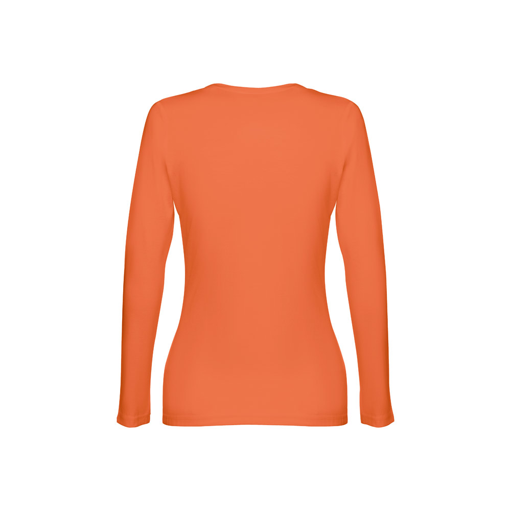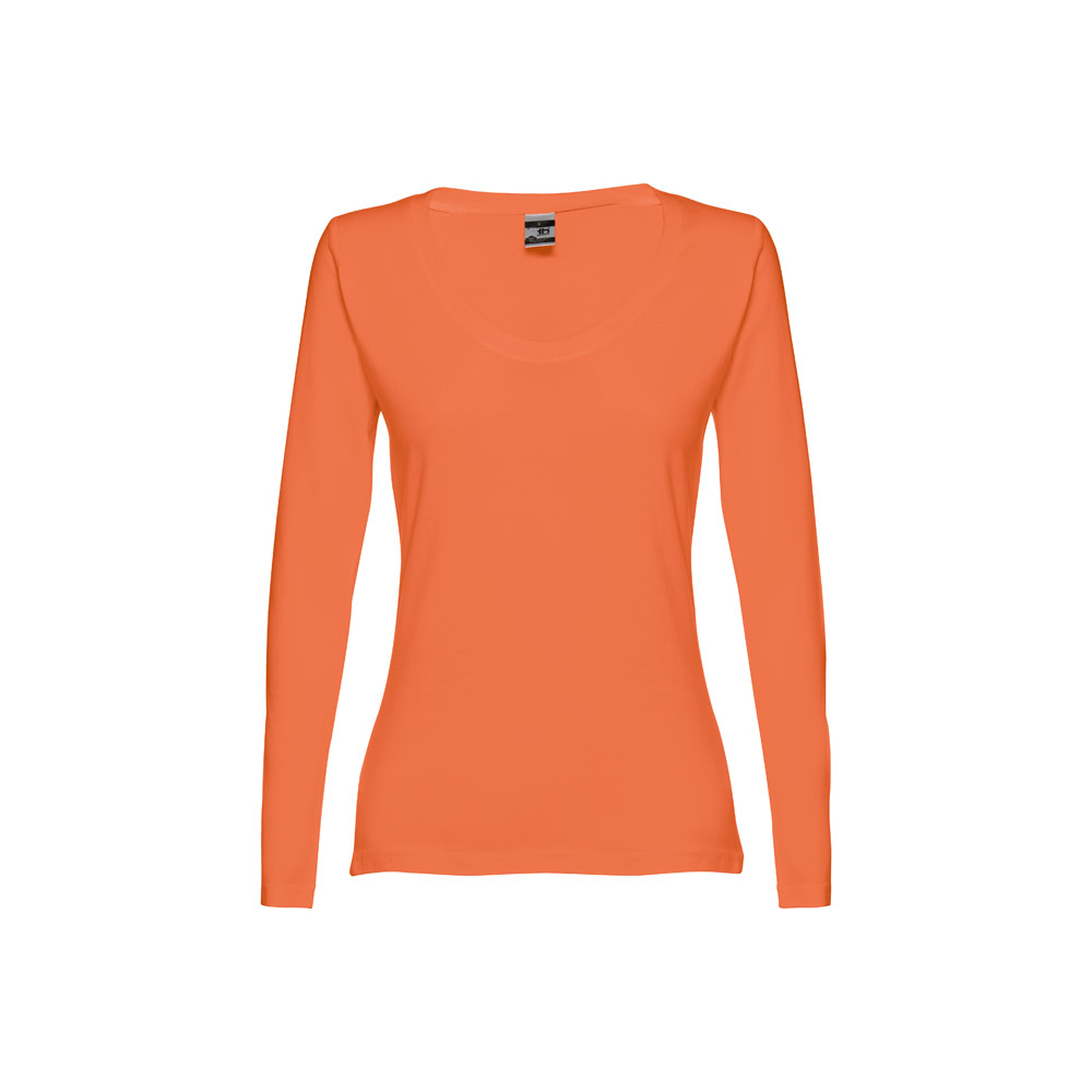 Damen Langarmshirt aus 100% Strickjersey und Baumwolle (150g / m²), tailliert mit kardiertem Baumwollfaden. Bei den Farben 194, 195 bestehend aus 60% Baumwolle und 40% Polyester und Farbe 183 bestehend aus 90% Baumwolle und 10% Viskose, mit Jersey-Kragen, Doppelnaht an Ärmeln und Saum. Größen: S, M, L, XL, XXL