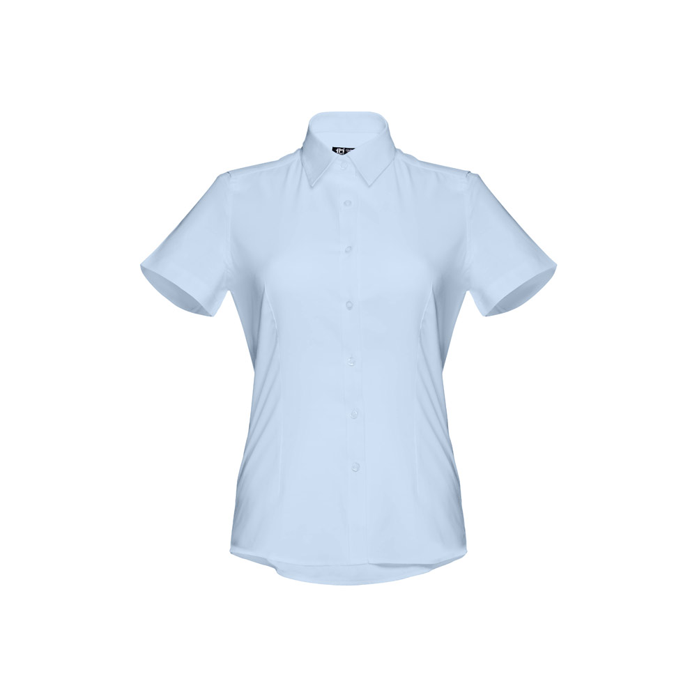Damen kurzarm Oxford Bluse aus 70% Baumwolle und 30% Polyester (130g / m²), tailliert mit einer Knopfleiste mit 7 Knöpfen und je 2 Vorder- und Rückenfalten. Doppelnaht an den Ärmeln. Größen: S, M, L, XL, XXL
