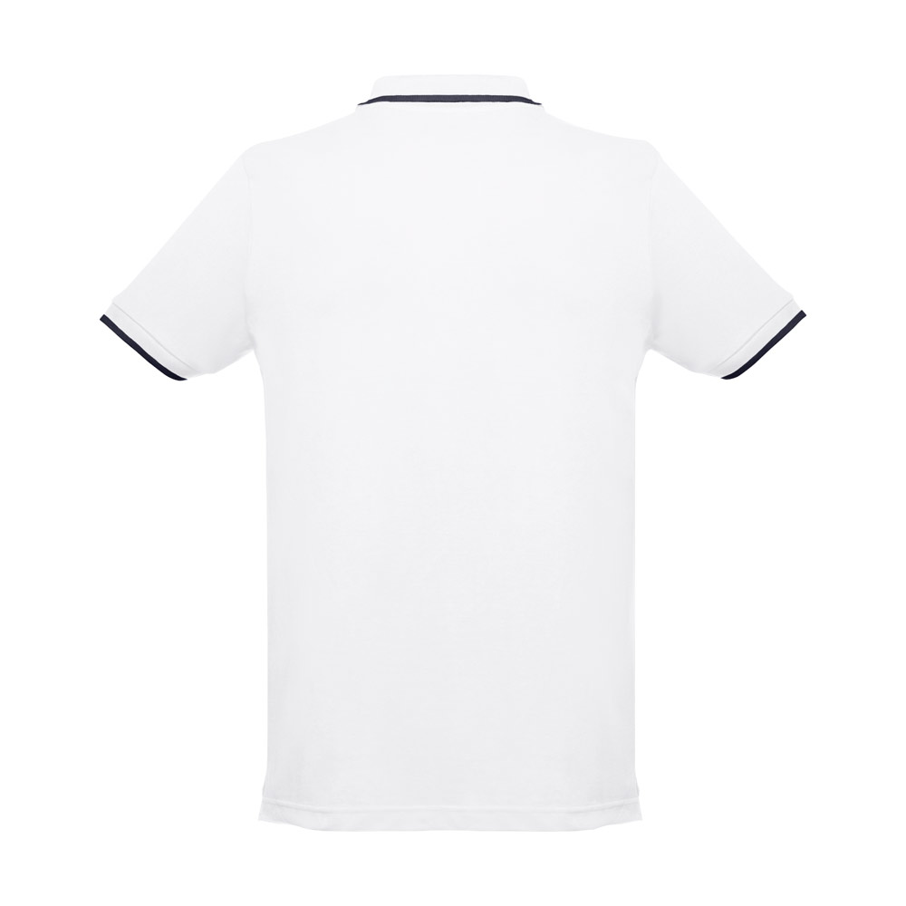 Herren Poloshirt aus Piqué Stoff 100% kardierter Baumwolle (210g / m²)," Slim Fit" mit geripptem Kragen und Ärmel. Der Kragen, die Knopfleiste und die Ärmel haben einen zweifarbigen Kontrast. Mit verstärkter Knopfleiste und 3 farblich abgestimmten Knöpfen, einem Ersatzknopf an der Innennaht und seitlichen Öffnungen. Größen: S, M, L, XL, XXL