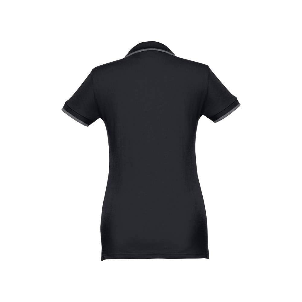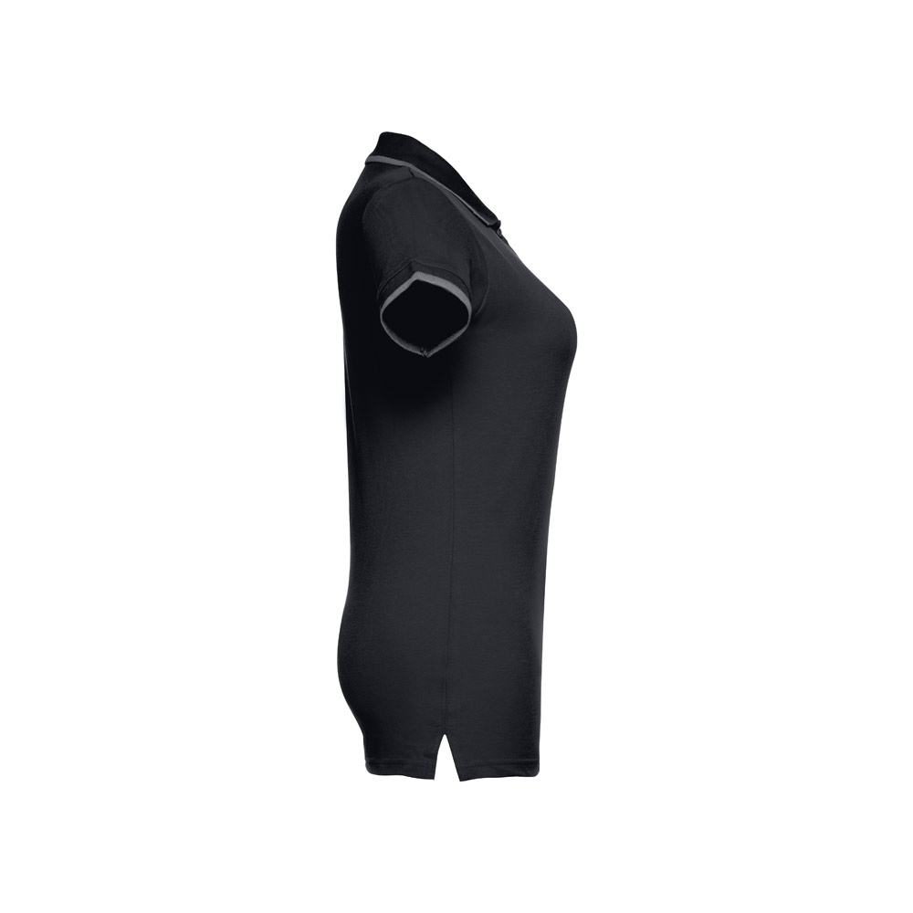 Damen Poloshirt aus Piqué Stoff 100% kardierter Baumwolle (210g / m²), tailliert mit geripptem Kragen und Ärmel. Der Kragen, die Knopfleiste und die Ärmel haben einen zweifarbigen Kontrast. Mit verstärkter Knopfleiste und 3 farblich abgestimmten Knöpfen, einem Ersatzknopf an der Innennaht und seitlichen Öffnungen. Bei der Farbe 183 bestehend aus 85% Baumwolle und 15% Viskose. Größen: S, M, L, XL, XXL
