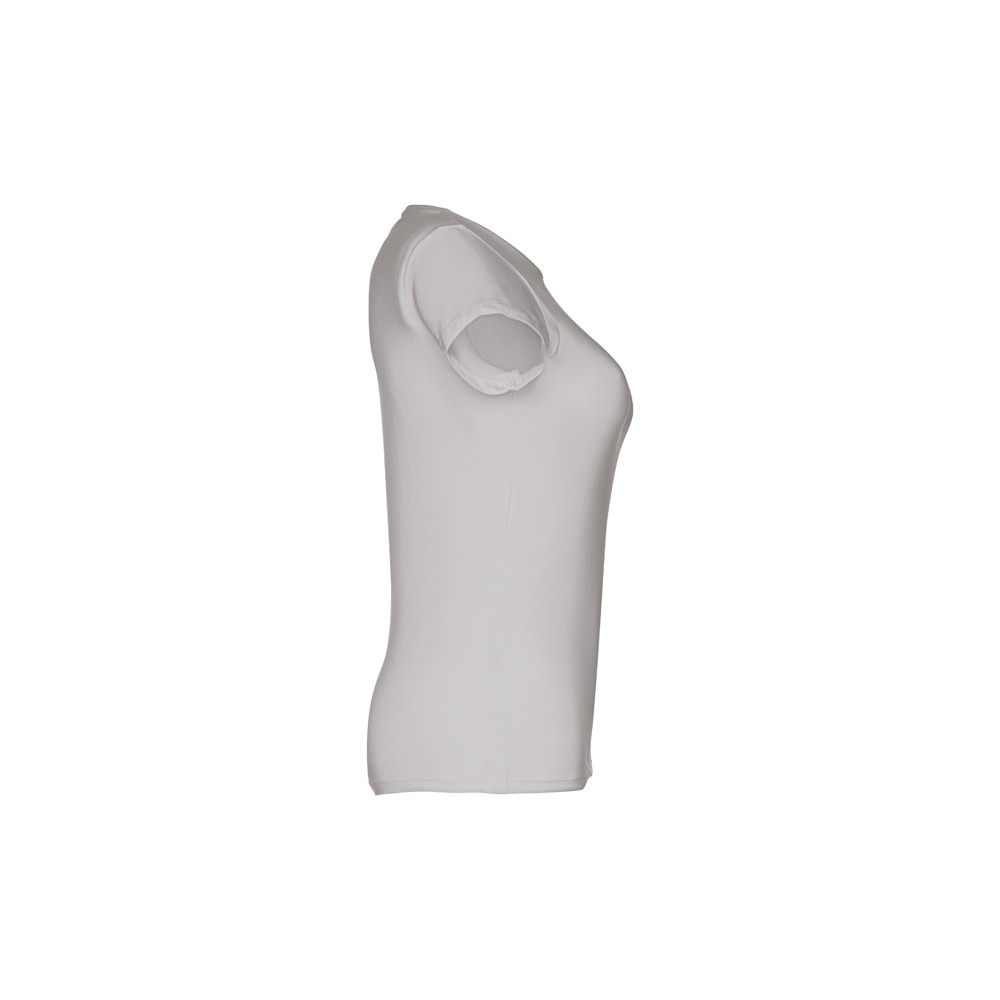 Damen T-Shirt aus 100% Strickjersey und Baumwolle (150g / m²) mit kardiertem Baumwollfaden, tailliert. Dieses hat einen dünnen Jersey-Kragen mit Satin-Verstärkungsband und eine Doppelnaht an Ärmeln und Saum. Bei der Farbe 183 bestehend aus 90% Baumwolle und 10% Viskose und Farbe 196 bestehend aus 98% Baumwolle und 2% Viskose. Größen: S, M, L, XL, XXL