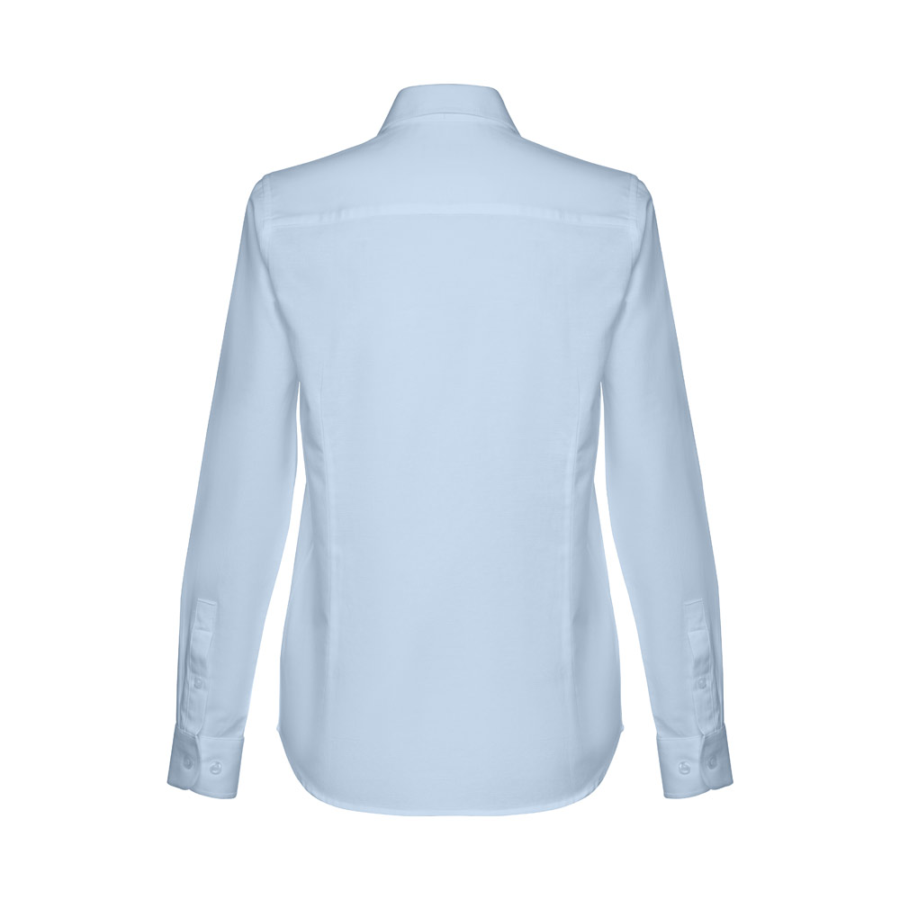 Damen langarm Oxford Bluse aus 70% Baumwolle und 30% Polyester (130g / m²), tailliert mit verstellbaren Manschetten mit 2 Knöpfen, einer Knopfleiste mit 7 farbigen Knöpfen und 2 Vorder- und 2 Rückennähte. Größen: S, M, L, XL, XXL