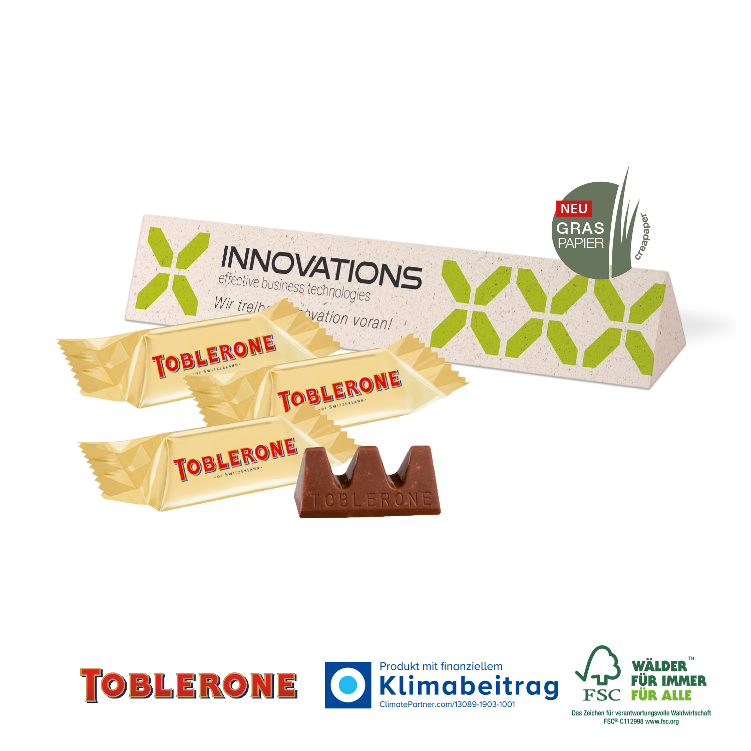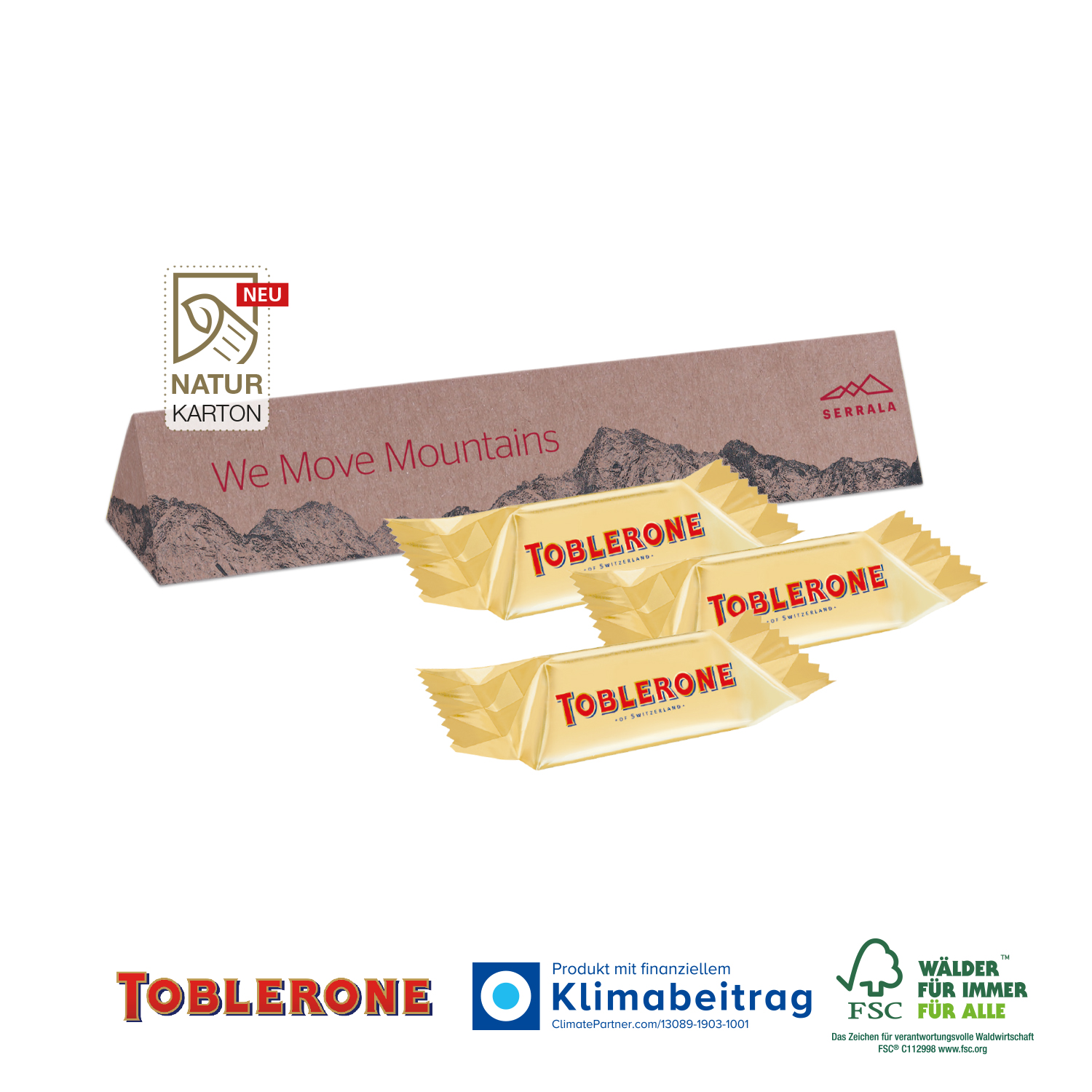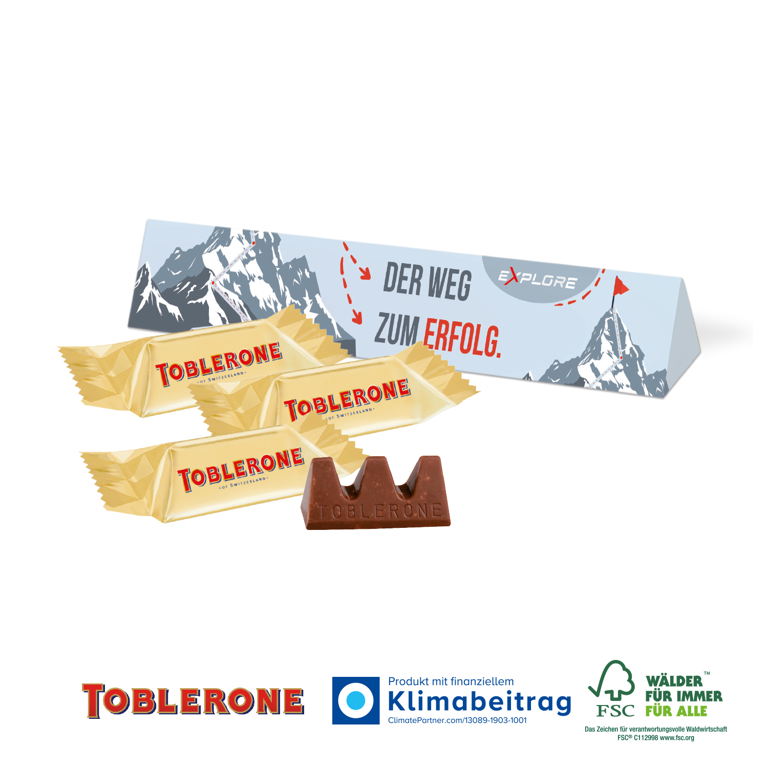 Kleiner Genuss-Gipfel! Mit den kultigen TOBLERONE Minis versüßen Sie Ihren Kunden und Kundinnen sowie Ihrem Team den Tag. Ihre Werbeaktion wird damit unverwechselbar.