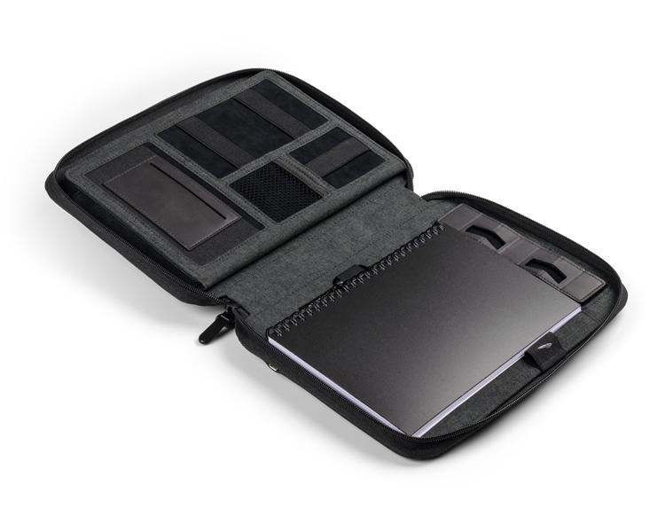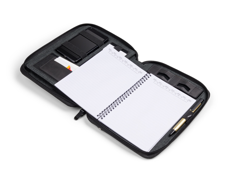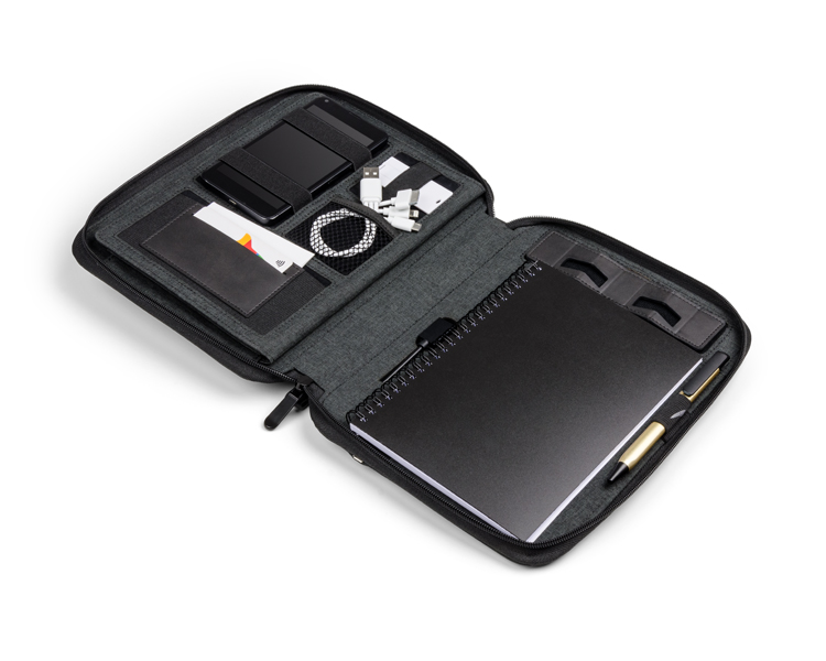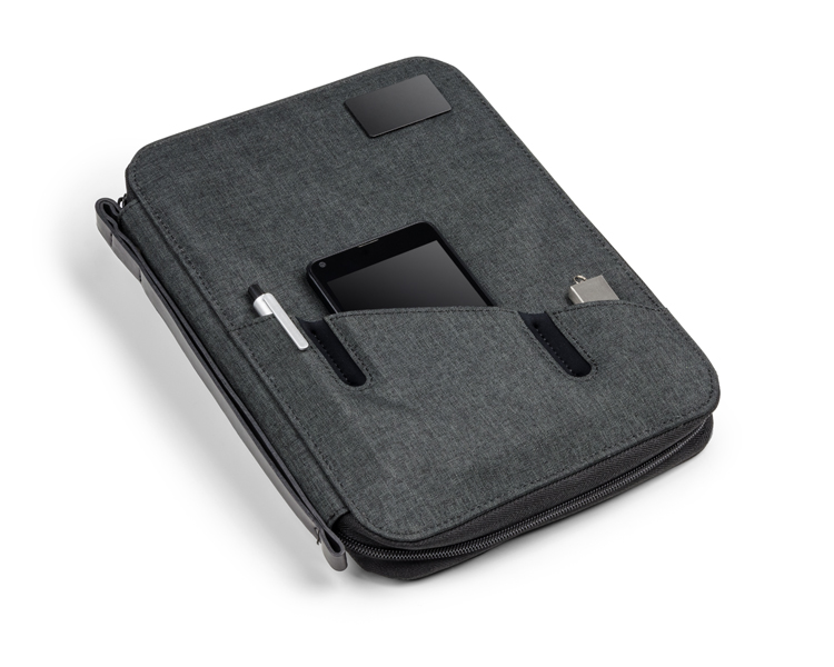 Modernes und praktisches Tablet-Etui mit Reißverschluss. Vorn gibt es drei Taschen zur Aufbewahrung der meistens gebrauchten Sachen wie Telefon, Kugelschreiber oder Visitenkarten. Im Innenbereich gibt es zahlreiche Trennfächer, Taschen und Halter für optimale Verteilung der Utensilien wie auch ein liniertes DIN A5-Notizbuch. Beim Platzieren des Tablets in einer speziellen Tasche kann man sich sicher sein, dass es gegen Beschädigungen entsprechend geschützt ist. Die eingebaute Power Bank mit einer Kapazität von 5000 mAh bietet enormen Energievorrat für das Tablet und andere Mobilgeräte, und ermöglicht den Betrieb selbst nach Entladung der Batterien. Die Aktentasche verfügt auch über einen Ständer für Tablets oder Smartphones.