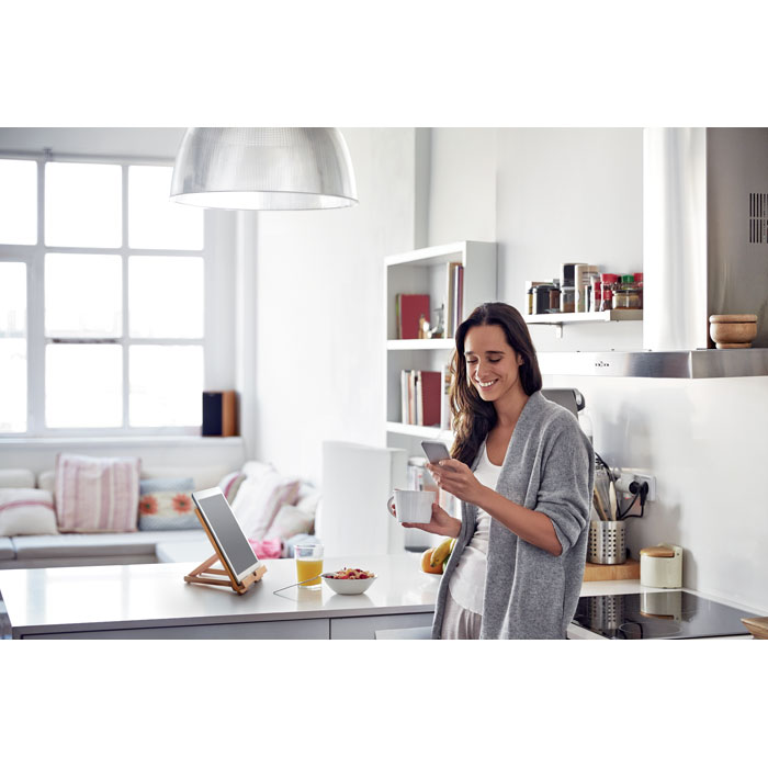Faltbarer Tablet- oder Smartphone-Halter aus Bambus. Bambus ist ein natürliches Produkt, es kann daher zu leichten Abweichungen in Farbe, Dekor und Maßen kommen.