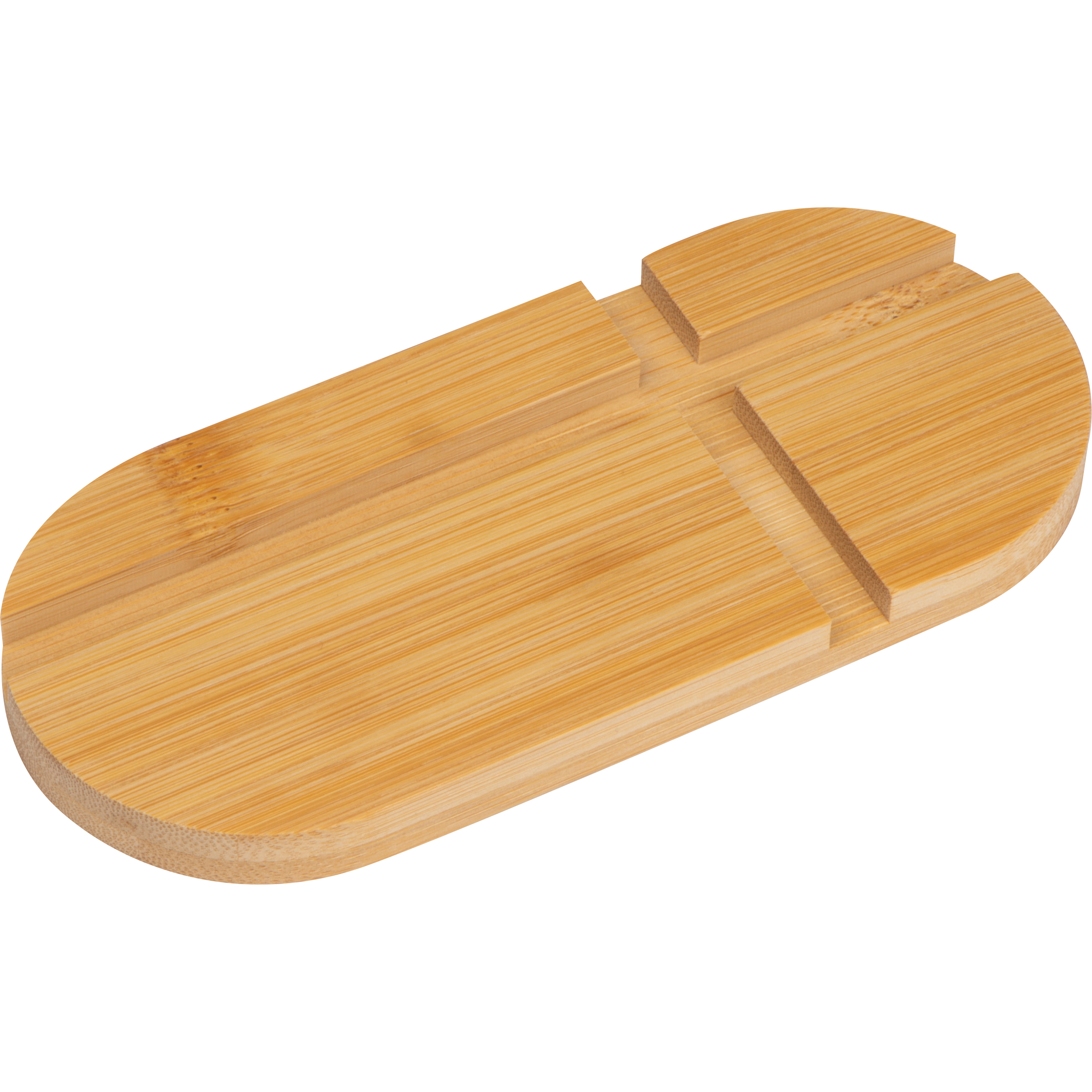 Tablet- und Smartphonehalter aus Bambus, sicherer Halt für den Schreibtisch oder unterwegs. Ihre Werbung wird auf die Halterung graviert.