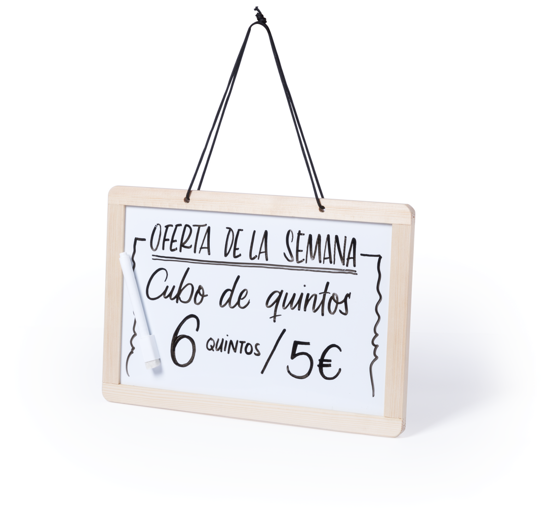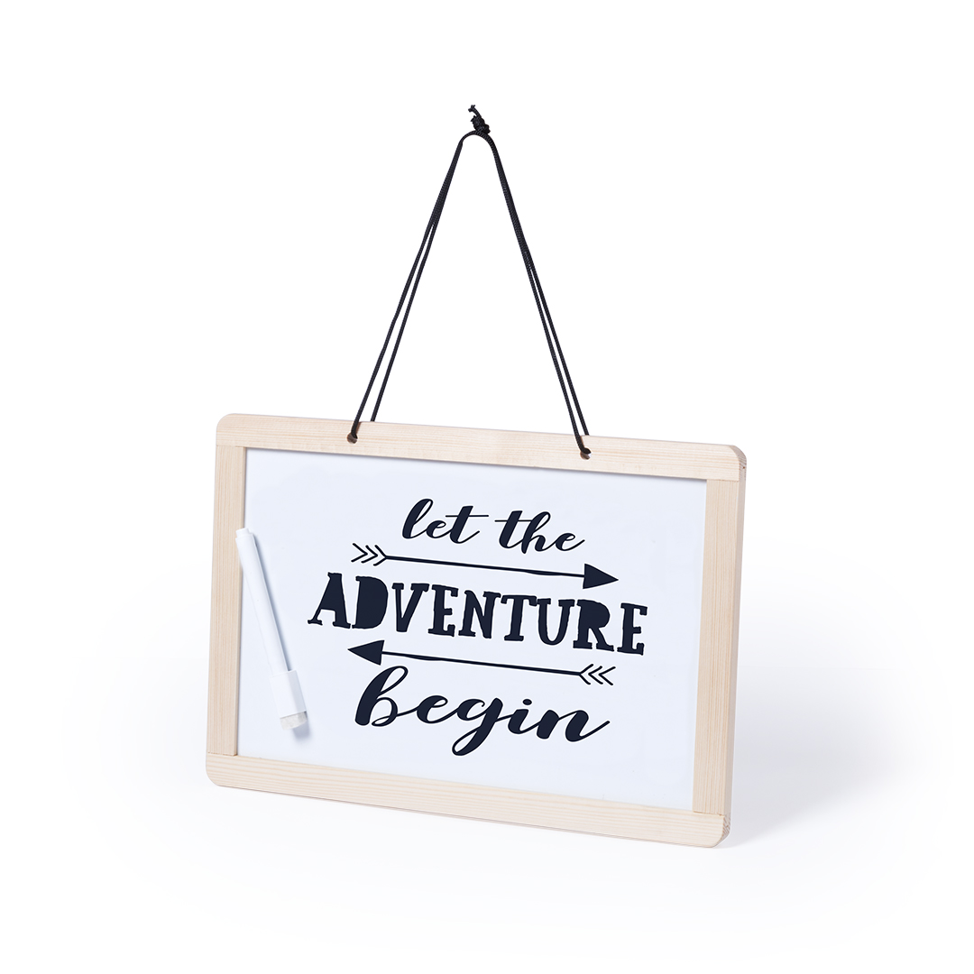 Beidseitig nutzbare Tafel zum Aufhängen, mit 2 verschiedenen Seiten: traditionelle Kreidetafel mit 3 Kreidestücken auf einer und Whiteboard mit Marker auf der anderen Seite. Mit doppelseitigem Radiergummi für Kreide und Marker.