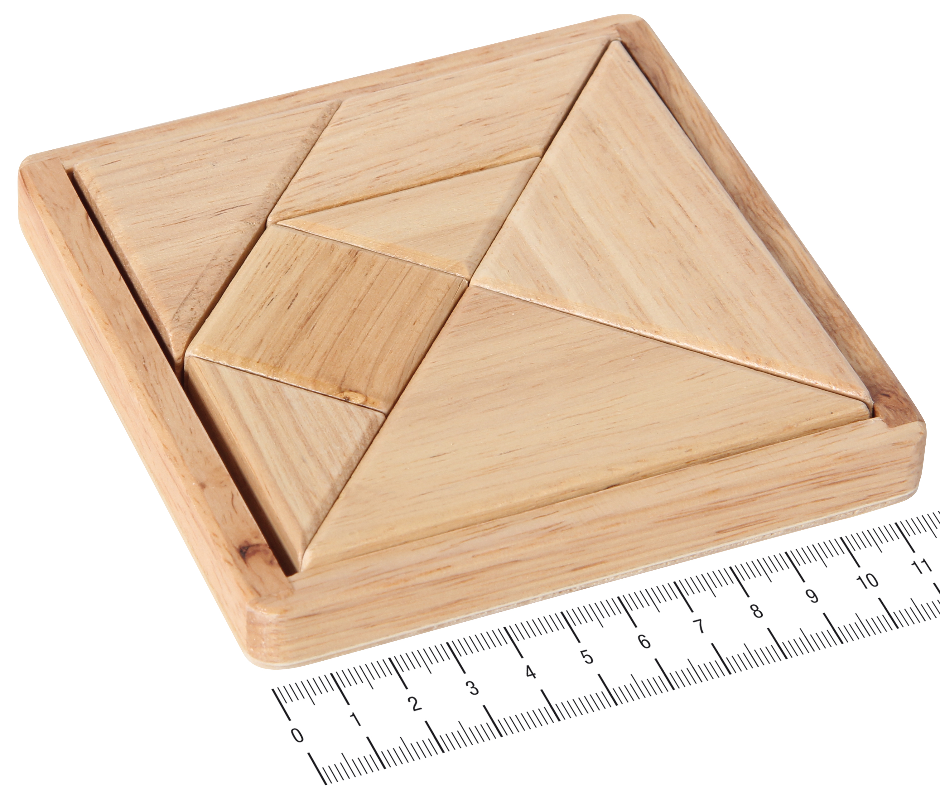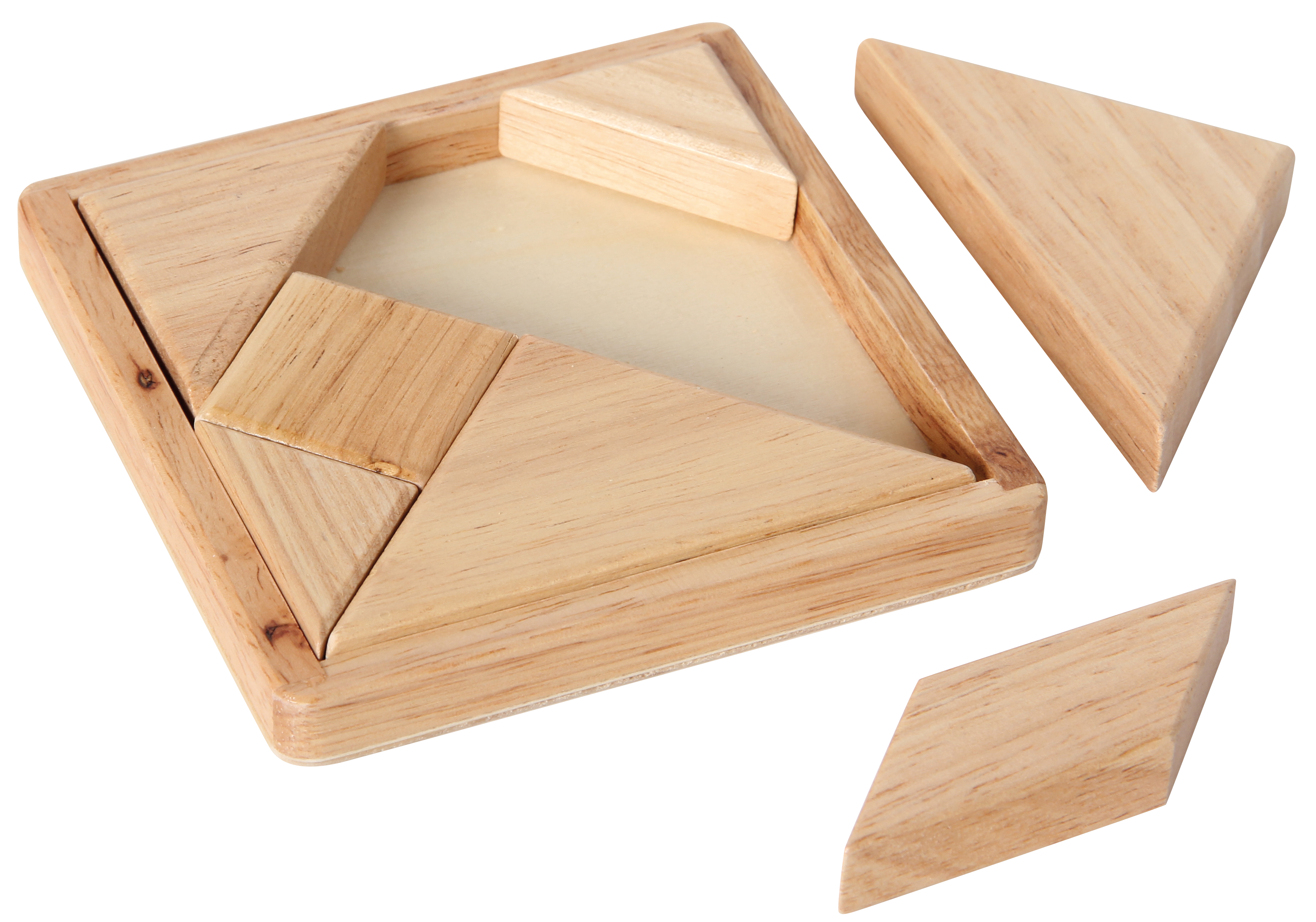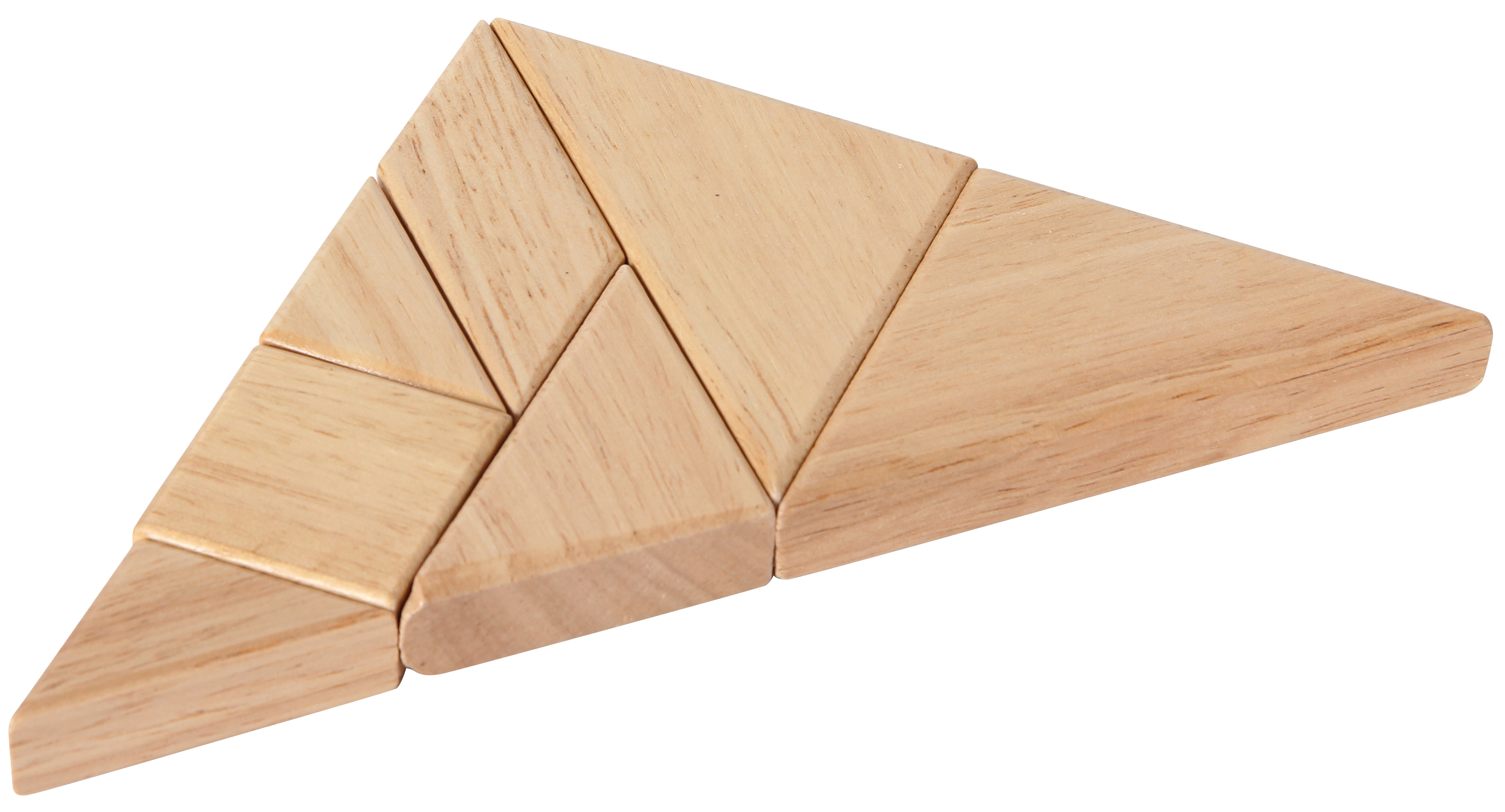 Legespiel aus Gummibaumholz. Aus fünf Dreiecken, einem Quadrat und einem Parallelogramm kann man viele Figuren legen.
