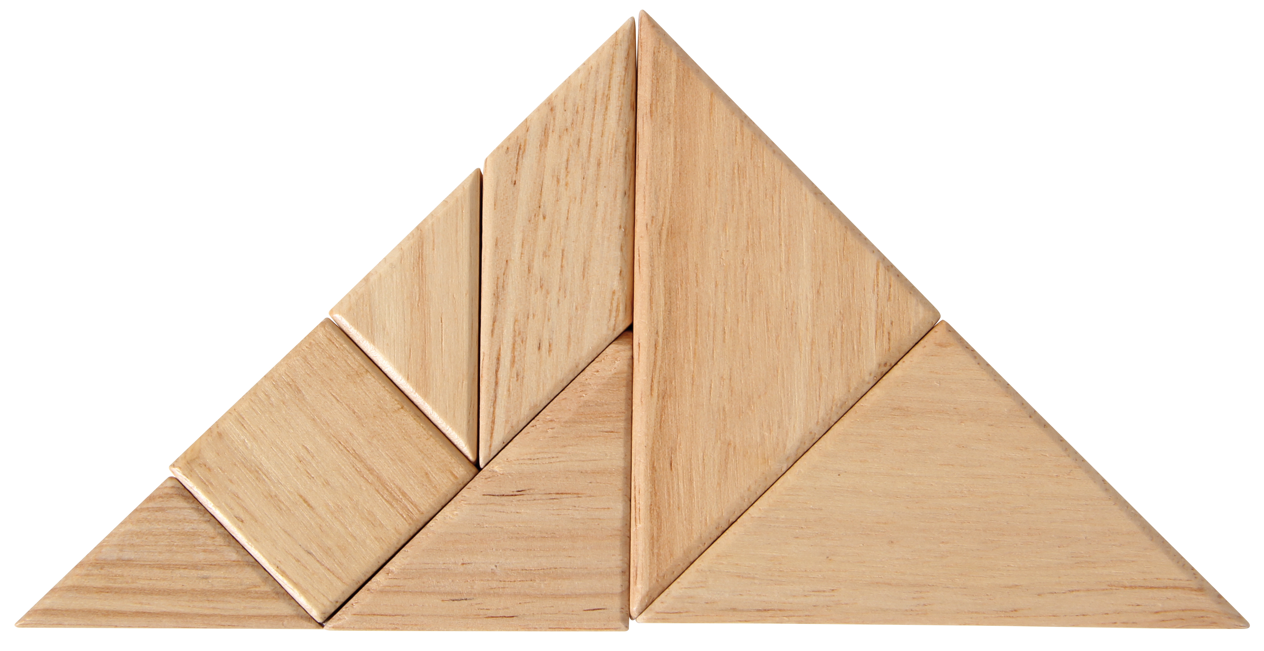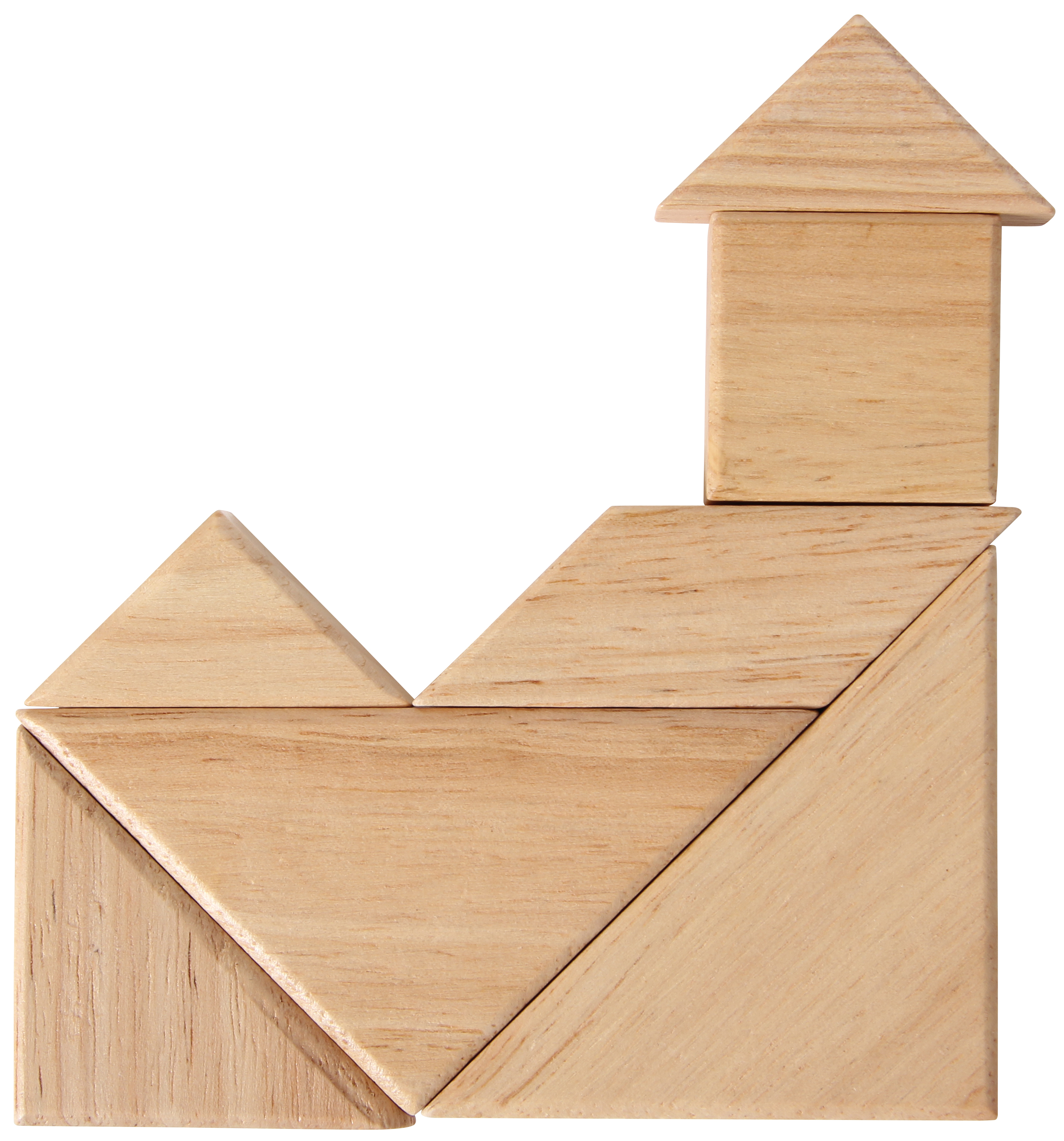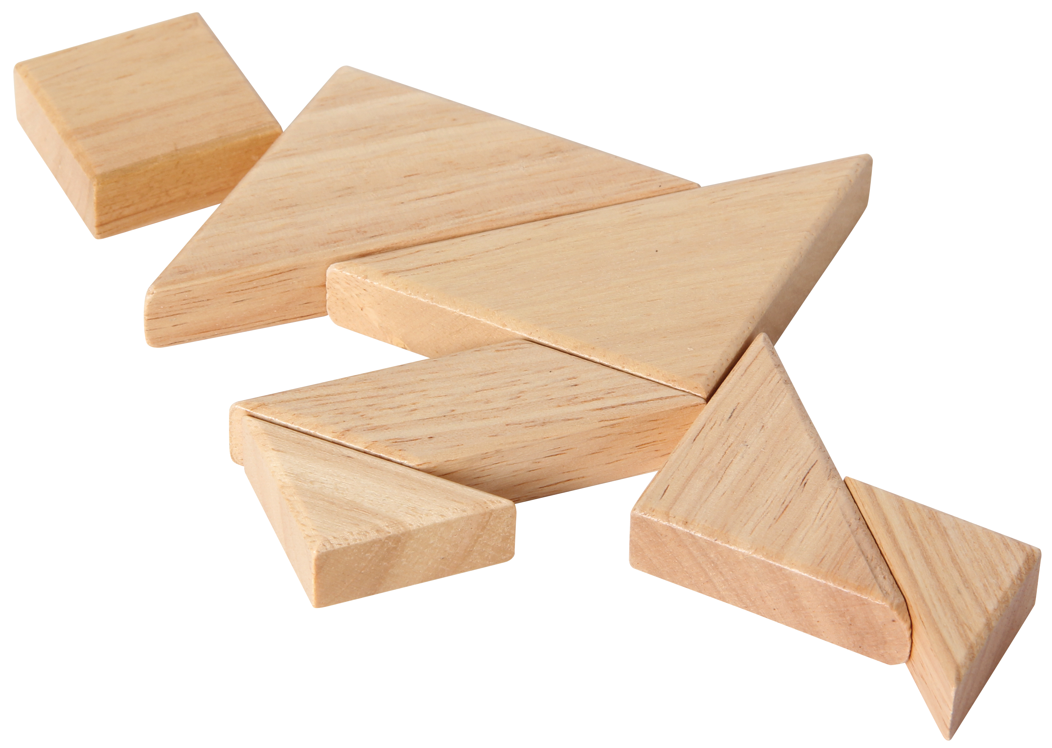 Legespiel aus Gummibaumholz. Aus fünf Dreiecken, einem Quadrat und einem Parallelogramm kann man viele Figuren legen.