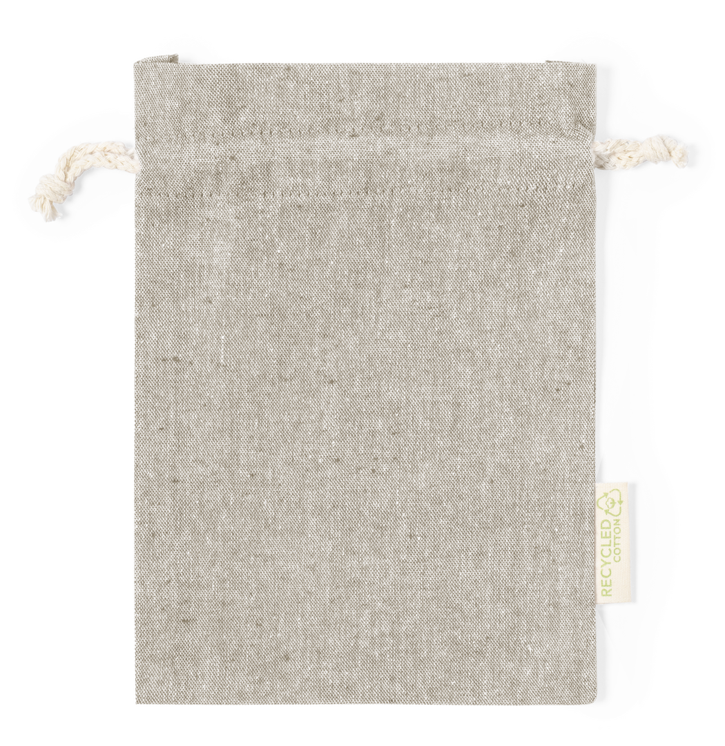 Umweltfreundliche Tasche aus widerstandsfähigem, recyceltem Baumwollmaterial von 120 g / m2. GRS-Zertifizierung (Global Recycled Standard), die die recycelte Herkunft des für die Herstellung des Produkts verwendeten Materials garantiert. Kordelzugverschluss aus Baumwolle und genähtes Finish, einschließlich Außenetikett mit Logo aus recycelter Baumwolle.