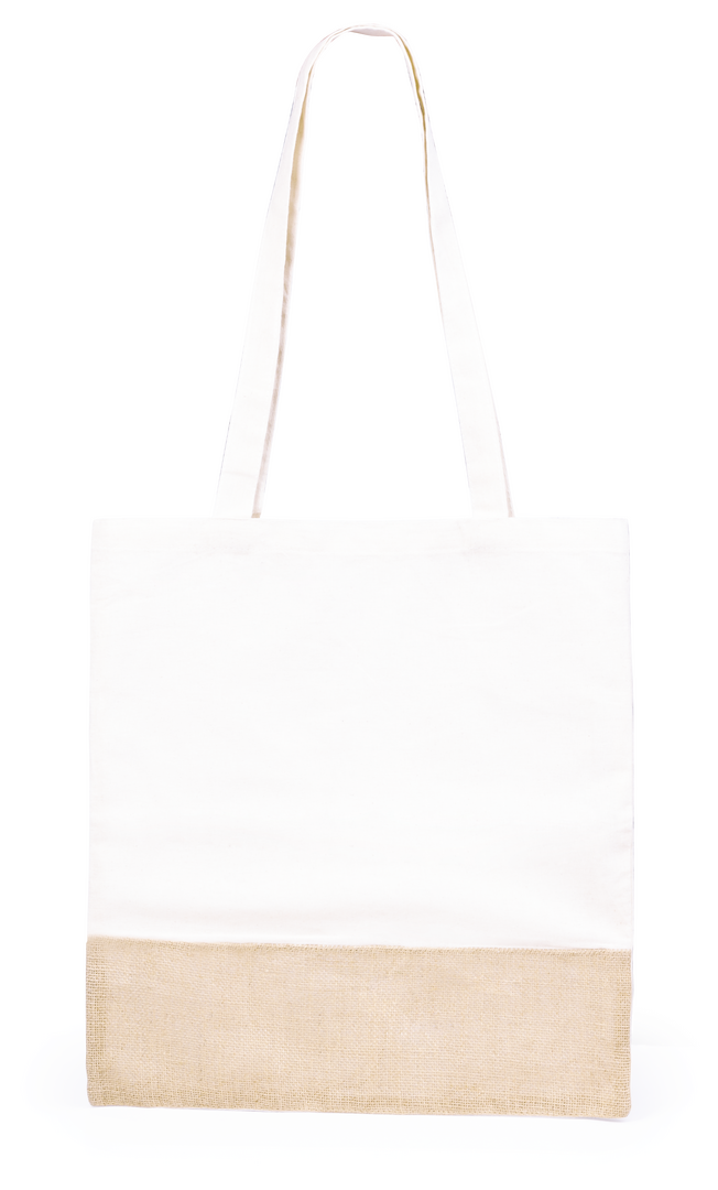 Ökologische Tasche aus einer robusten Kombination von natürlichen Materialien - Baumwolle und Jutefasern (245 g / m2). Mit attraktivem, zweifarbigem Design, Steppnähten und 70 cm langen, verstärkten Henkeln. Belastbar mit bis zu 8 kg.
