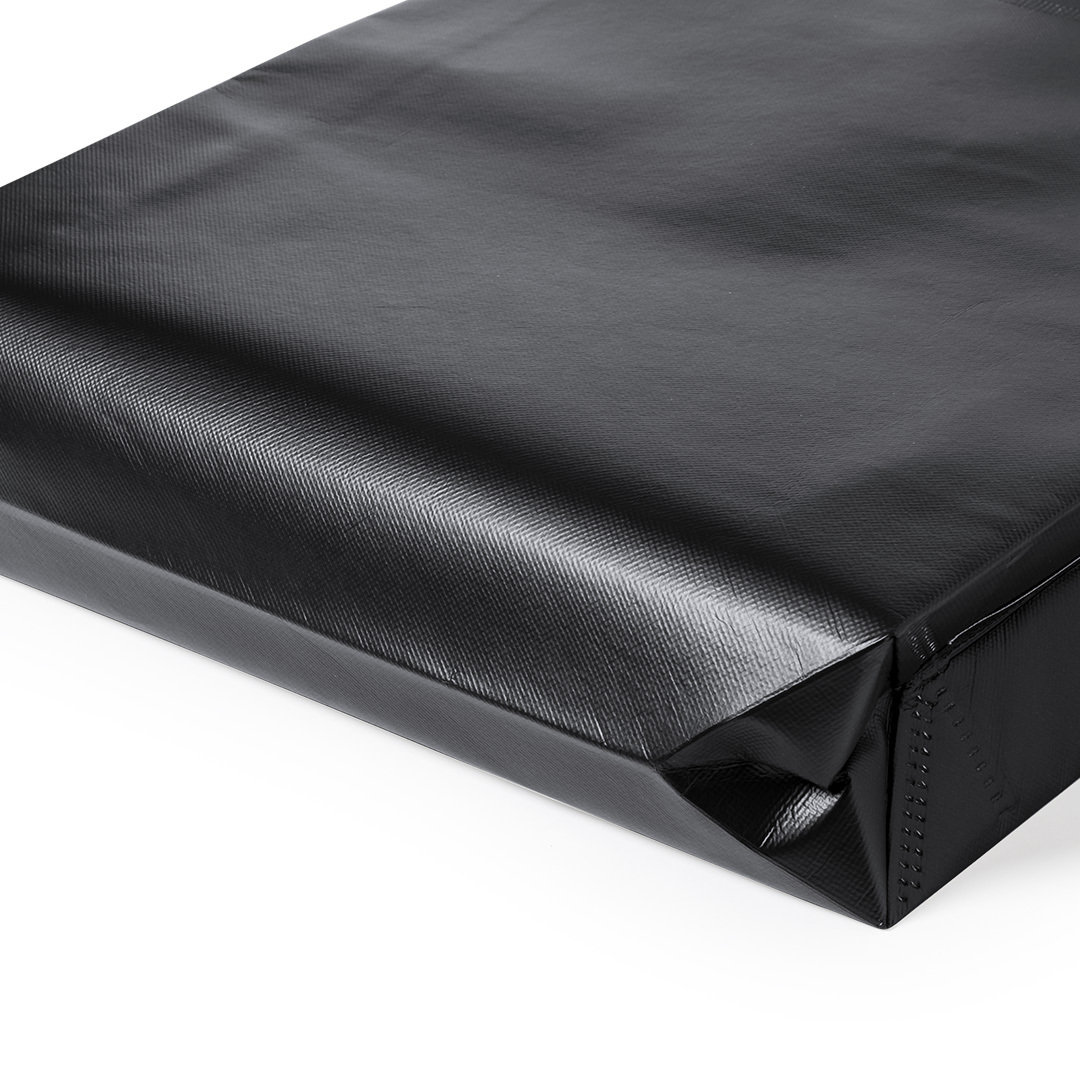 Linie "Natur" Tasche, hergestellt aus 120g / m2 recyceltem Vliesstoff mit Laminierung. Hergestellt in Europa, mit verschweißter Oberfläche, Seitenfalte, langen Griffen und Öko / Made-Emblem auf der Tasche.