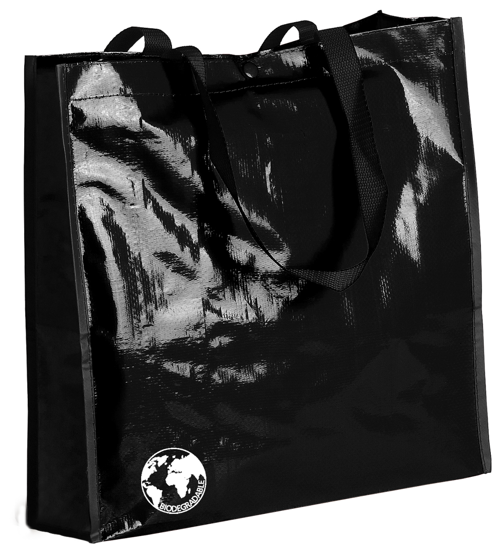 Biologisch abbaubare Tasche aus robustem, laminiertem Material in einer Vielzahl von lebendigen, glänzenden Farben. Mit 70 cm langen, verstärkten Griffen aus Nylon, verstärktem Zwickel mit Paspel sowie Druckknopf und Steppnähten. Belastbar mit bis zu 12 kg.