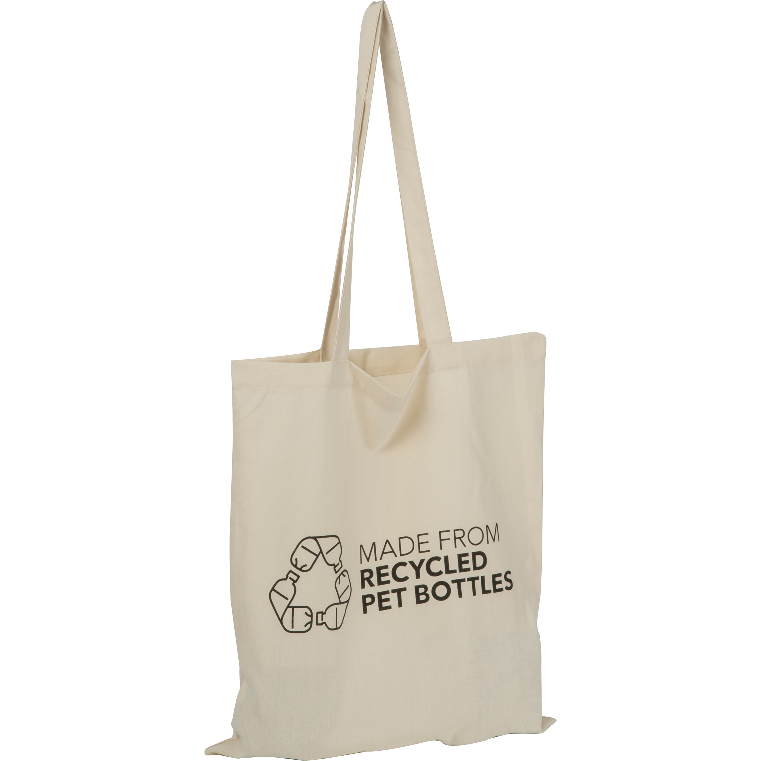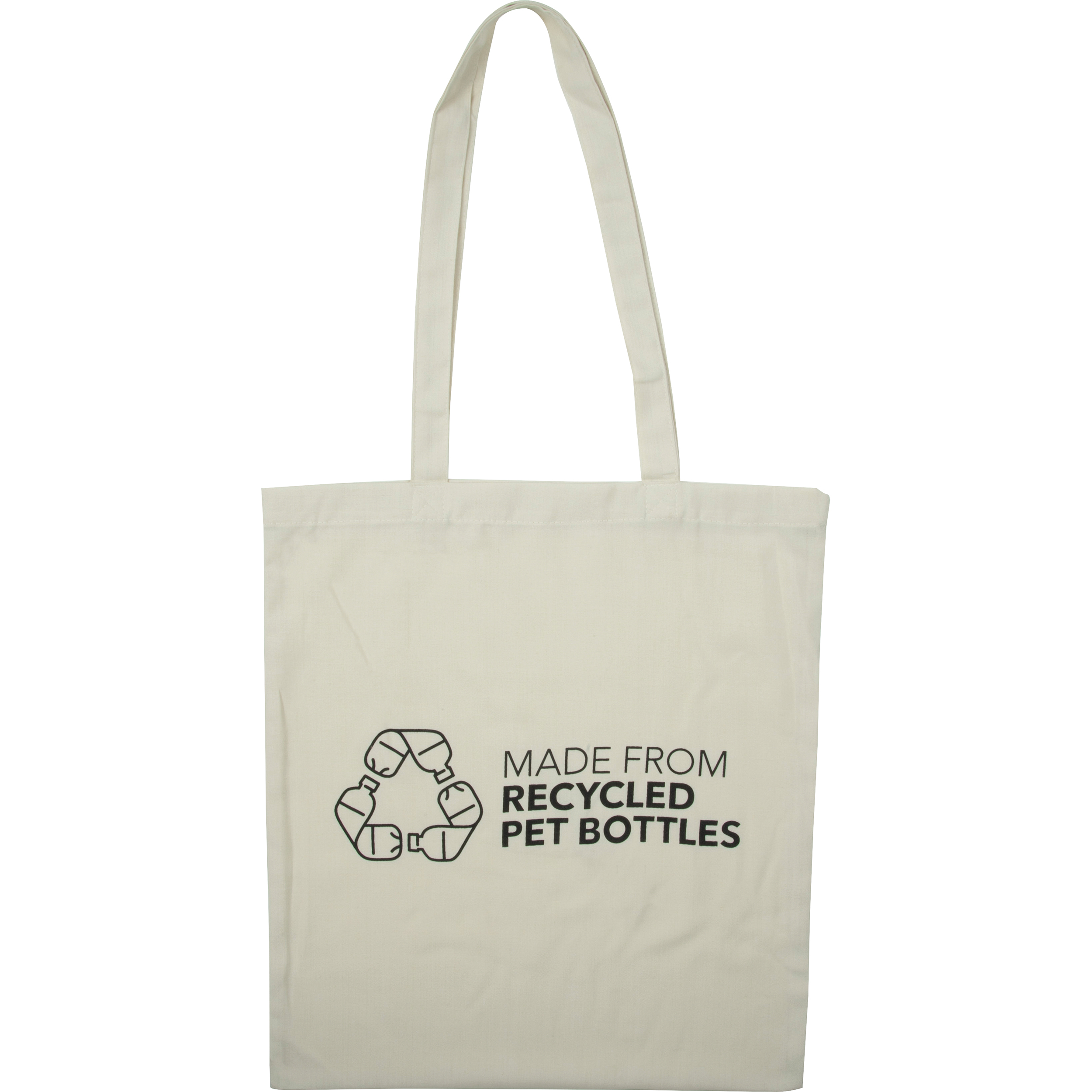 Tragetasche aus recyceltem RPET-Material (Grammatur 140 g / m²) mit dauerhaft aufgedrucktem MADE FROM RECYCLED BOTTLES-Logo auf einer Seite. Die andere Seite bietet ausreichend Platz für das Kundenlogo. Langlebig und ein idealer Werbeträger! Ihr Logo setzen wir per Siebdruck um.