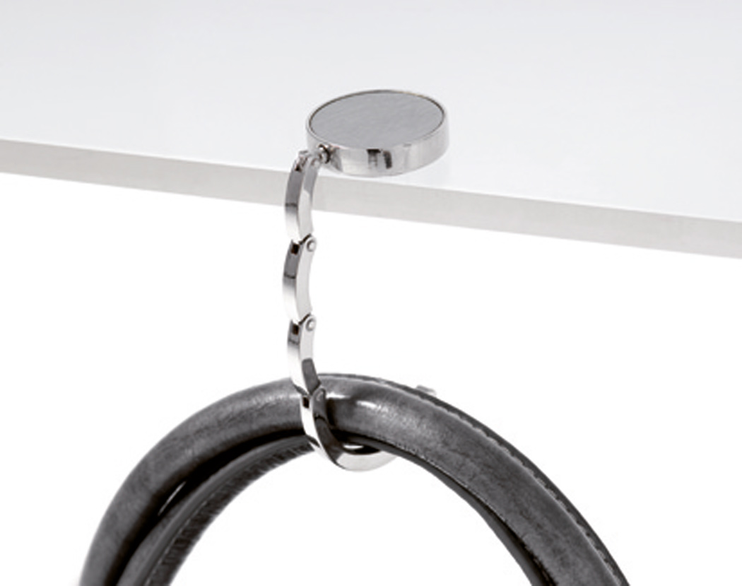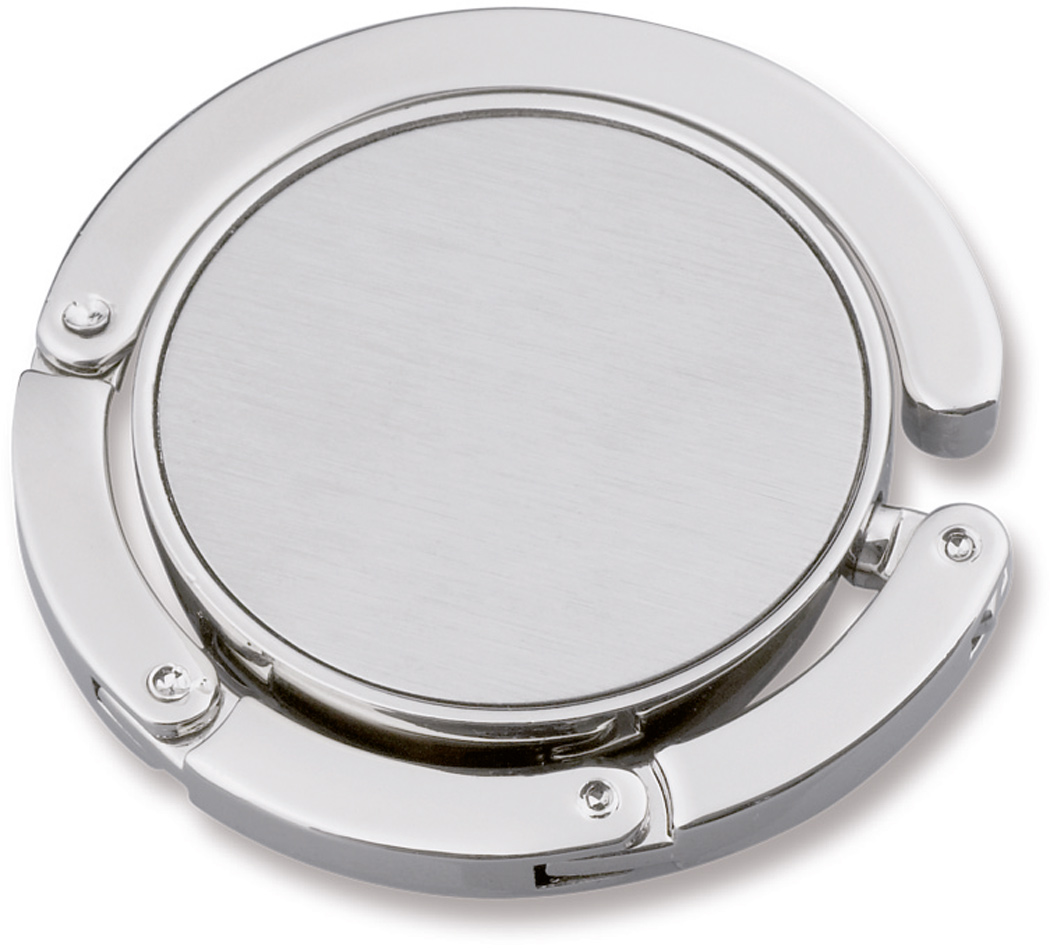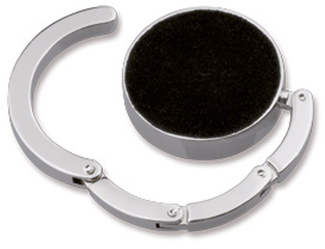 Handtaschenhalter HOLD IT, ausklappbar: Oberseite aus glänzendem Metall für Werbeanbringung, beflockte Unterseite sorgt für sicheren Halt auf glatten Oberflächen