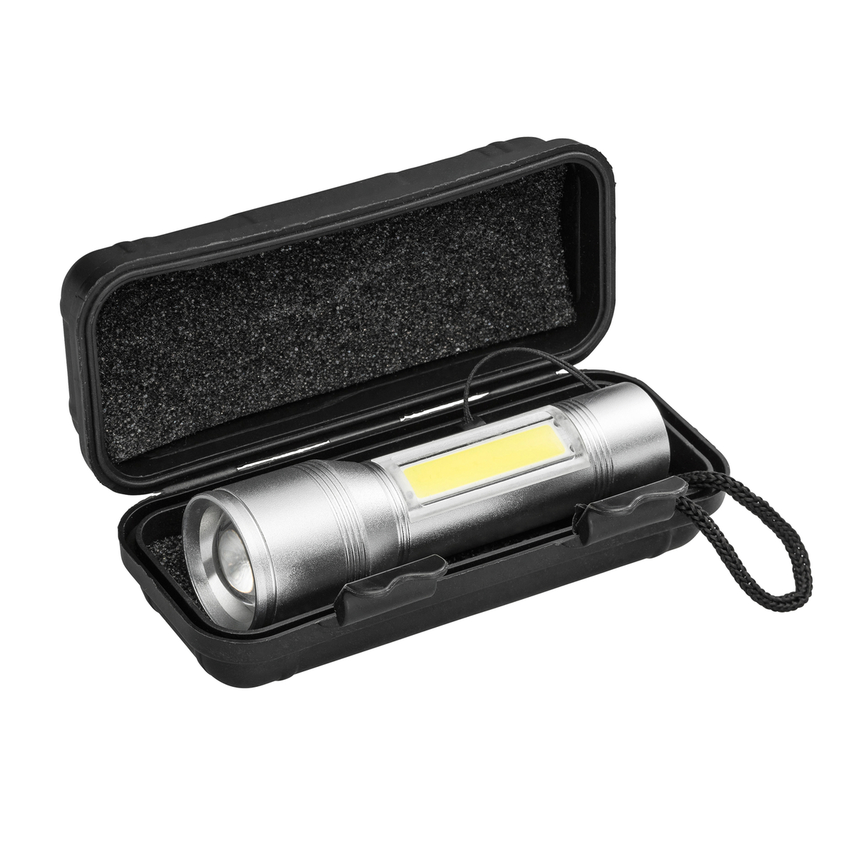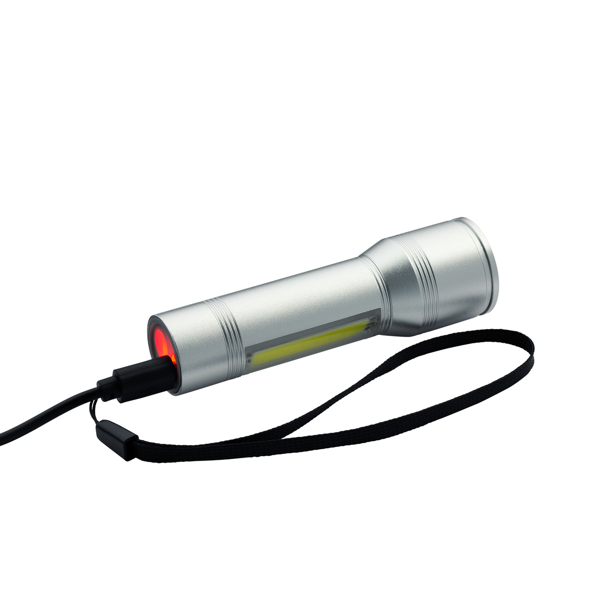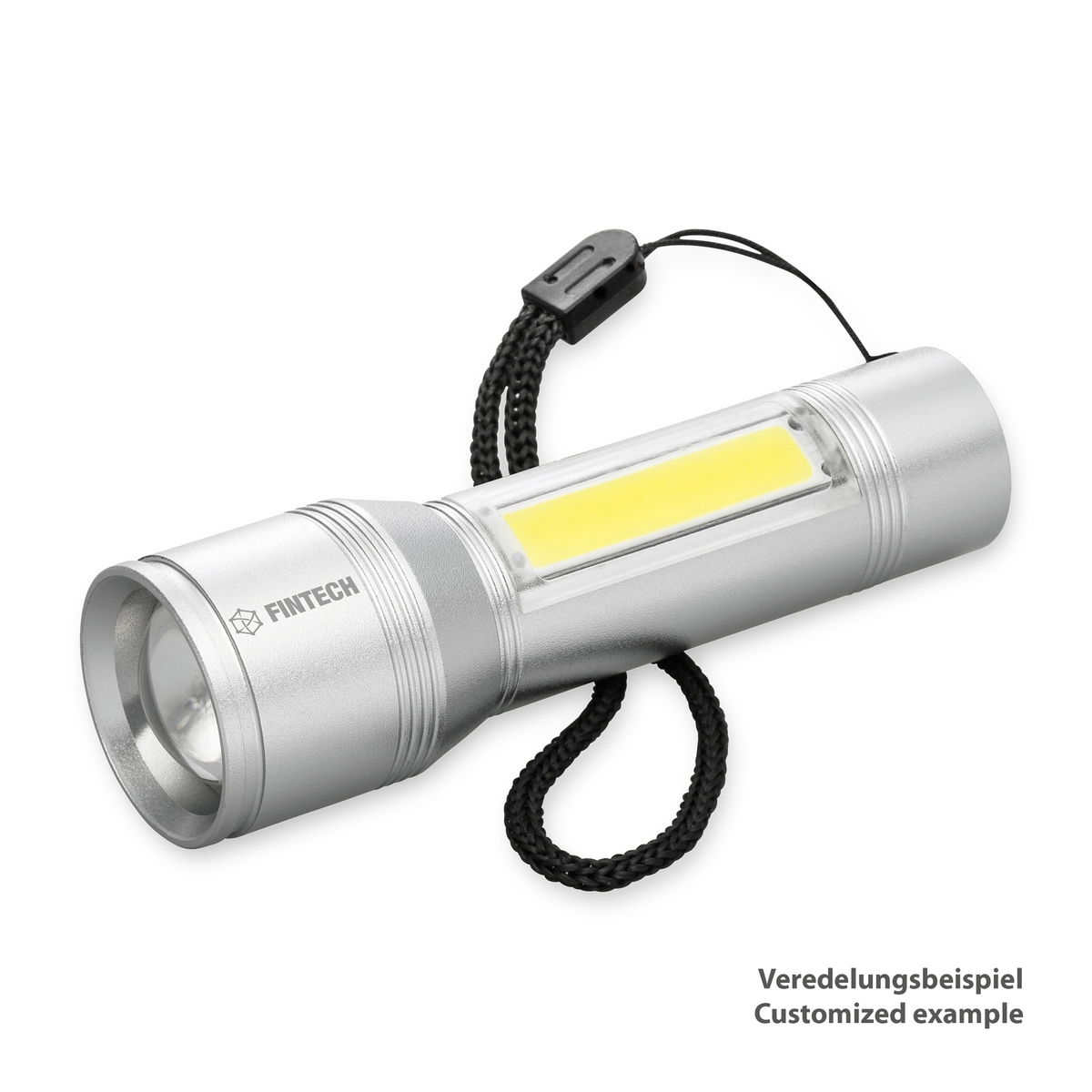 Die wiederaufladbare Taschenlampe aus Aluminium ist silbern oder schwarz eloxiert verfügbar. Sie verfügt über eine LED-Leuchte mit Lichtkegel-Zoom und einer seitlichen COB-Leuchte. In Höhe des Kopfes der Taschenlampe befindet sich ein schwarzes Griffband. Die 96 Lumen starke LED-Leuchte hat eine Akkulaufzeit von 45 Minuten (maximale Lichthelligkeit = 7200 Candela). Die COB- Leuchte hat mit ihren 100 Lumen eine Akku-laufzeit von einer Stunde (maximale Lichthelligkeit = 60 Candela). Insgesamt hat die Taschenlampe drei Lichtmodi: eine LED-Leuchte vorne, ein "Flashlight" und eine COB-Leuchte seitlich. Sie benötigen keine Batterien mehr, da die Taschenlampe über den Mikro-USB-Anschluss jederzeit wieder aufgeladen werden kann. Ein passendes Ladekabel (USB-A auf Mikro-USB) ist im Lieferumfang enthalten. Die Lampe wird in einer handlichen Kunststoffbox und Geschenkverpackung geliefert. Veredelbar mit einer hochwertigen Lasergravur oder einem einfarbigen Tampondruck.