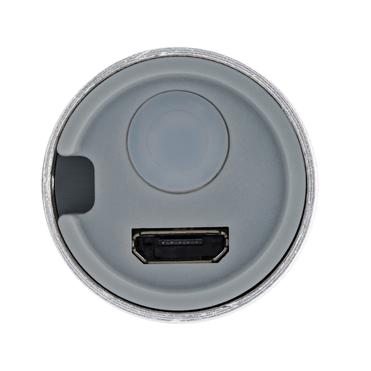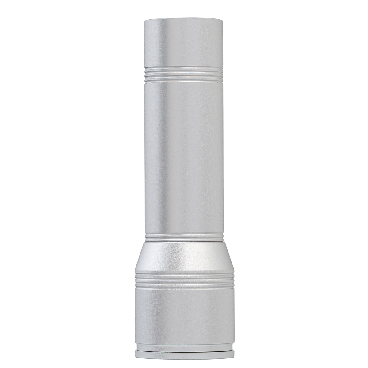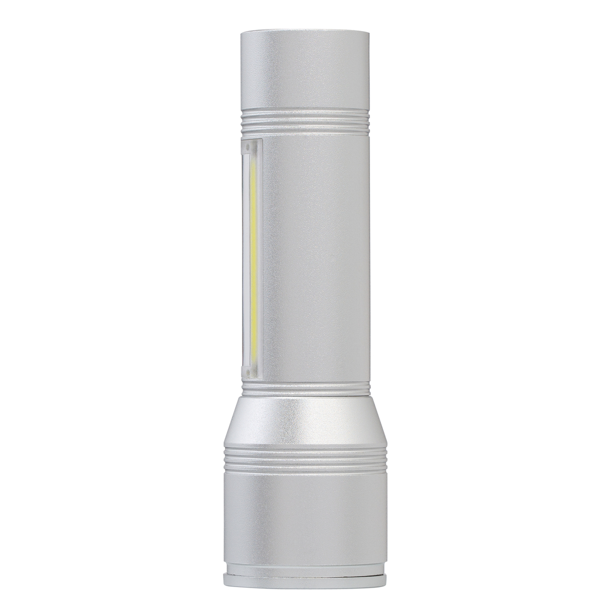 Die wiederaufladbare Taschenlampe aus Aluminium ist silbern oder schwarz eloxiert verfügbar. Sie verfügt über eine LED-Leuchte mit Lichtkegel-Zoom und einer seitlichen COB-Leuchte. In Höhe des Kopfes der Taschenlampe befindet sich ein schwarzes Griffband. Die 96 Lumen starke LED-Leuchte hat eine Akkulaufzeit von 45 Minuten (maximale Lichthelligkeit = 7200 Candela). Die COB- Leuchte hat mit ihren 100 Lumen eine Akku-laufzeit von einer Stunde (maximale Lichthelligkeit = 60 Candela). Insgesamt hat die Taschenlampe drei Lichtmodi: eine LED-Leuchte vorne, ein "Flashlight" und eine COB-Leuchte seitlich. Sie benötigen keine Batterien mehr, da die Taschenlampe über den Mikro-USB-Anschluss jederzeit wieder aufgeladen werden kann. Ein passendes Ladekabel (USB-A auf Mikro-USB) ist im Lieferumfang enthalten. Die Lampe wird in einer handlichen Kunststoffbox und Geschenkverpackung geliefert. Veredelbar mit einer hochwertigen Lasergravur oder einem einfarbigen Tampondruck.