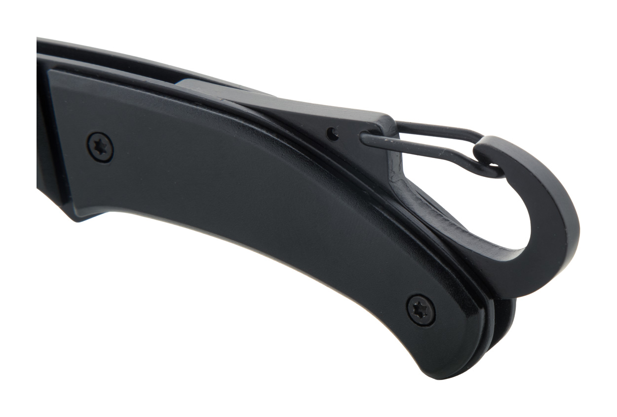 Komplett schwarzes Edelstahl-Taschenmesser mit Aluminium-Griffen, Karabiner und Sicherheitsverschluss.